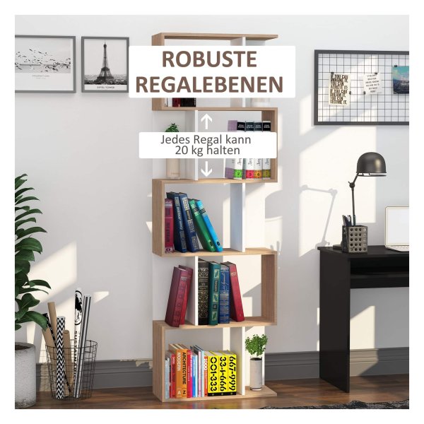 De boekenkast is gemaakt van spaanplaat in een natuurlijk hout en witte kleur. De afmetingen zijn 60 cm breed, 24 cm diep en 148 cm hoog. Elke plank kan tot 20 kg dragen, wat voldoende is voor al uw boeken en decoratieve items. Montage van de kast is vereist, maar met de duidelijke instructies is dit een eenvoudige klus.
