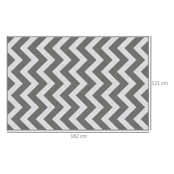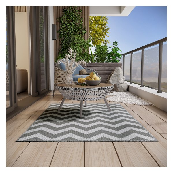 Met een afmeting van 121 x 182 cm past dit tapijt perfect op jouw terras of in een camper, paviljoen of wintertuin. Het lichtgrijze en witte kleurenschema geeft een moderne en frisse uitstraling aan elke buitenruimte.