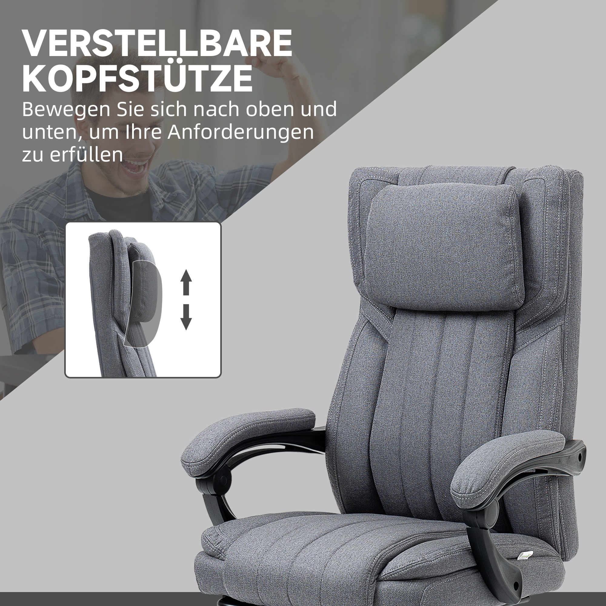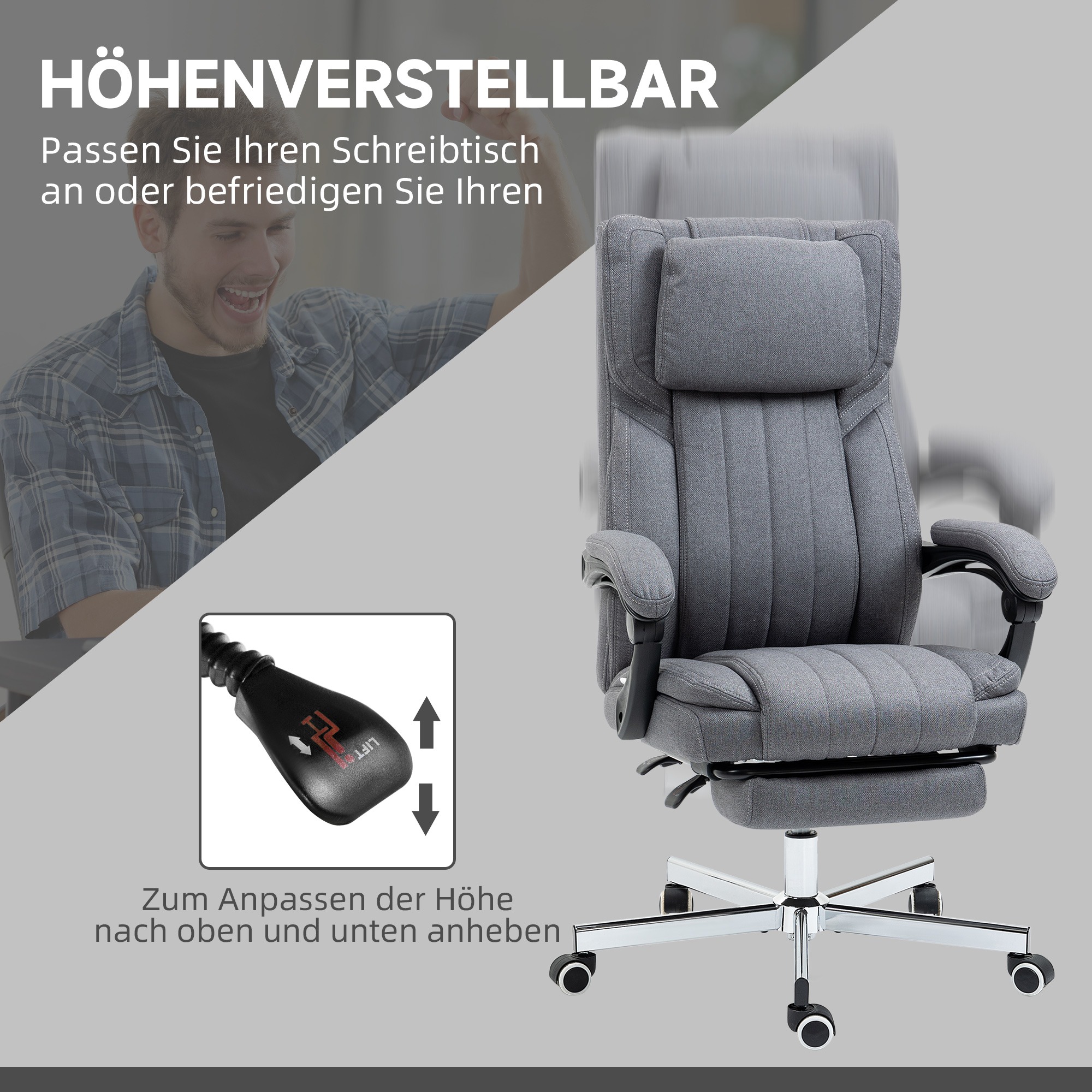Bovendien is de stoel verstelbaar tot 49 cm, zodat deze perfect past bij uw zitpositie. De zachte bekleding in linnenoptiek is aangenaam en huidvriendelijk, waardoor u comfortabel kunt zitten of liggen. De vijf wielen zorgen voor maximale bewegingsvrijheid, zodat u gemakkelijk kunt verplaatsen zonder op te staan.