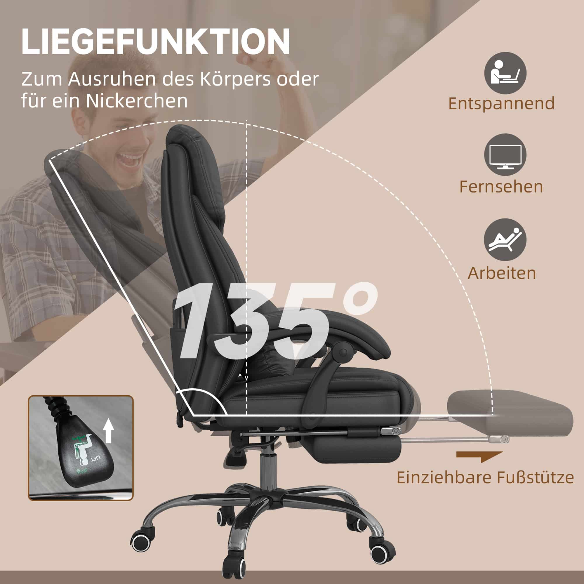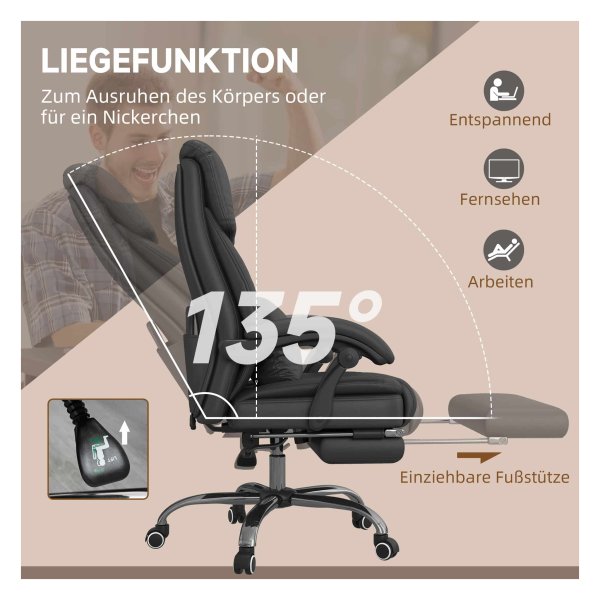 De rugleuning van de massagestoel kan worden aangepast tot 135° en is voorzien van een handige vouwfoot-out voetsteun. Hierdoor kun je zelf de meest comfortabele positie kiezen om te ontspannen. De gezellige rugleuning, opgevulde kussens en lumbale kussen zorgen voor maximaal comfort en ondersteuning tijdens het gebruik van de massagestoel.