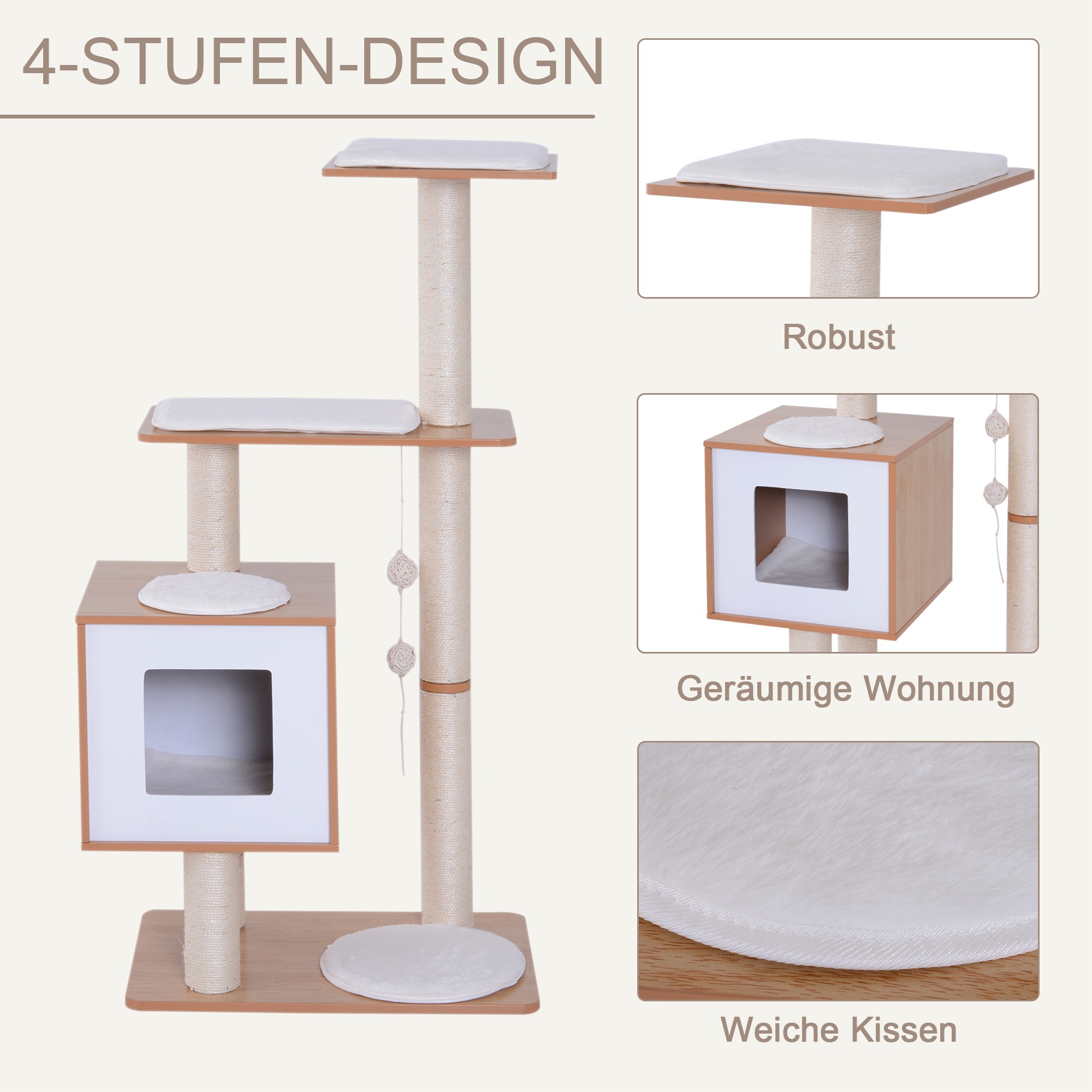 Deze kattenspeeltoren is gemaakt van stevig hout en biedt optimale stabiliteit voor je harige vriend. Het sisal materiaal zorgt voor extra comfort en maakt de speeltoren extra aantrekkelijk voor katten om te krabben. Met 4 niveaus, een verborgen doos, 2 sisal kolommen en 2 hangende speelballetjes, zal je kat zich geen moment vervelen.