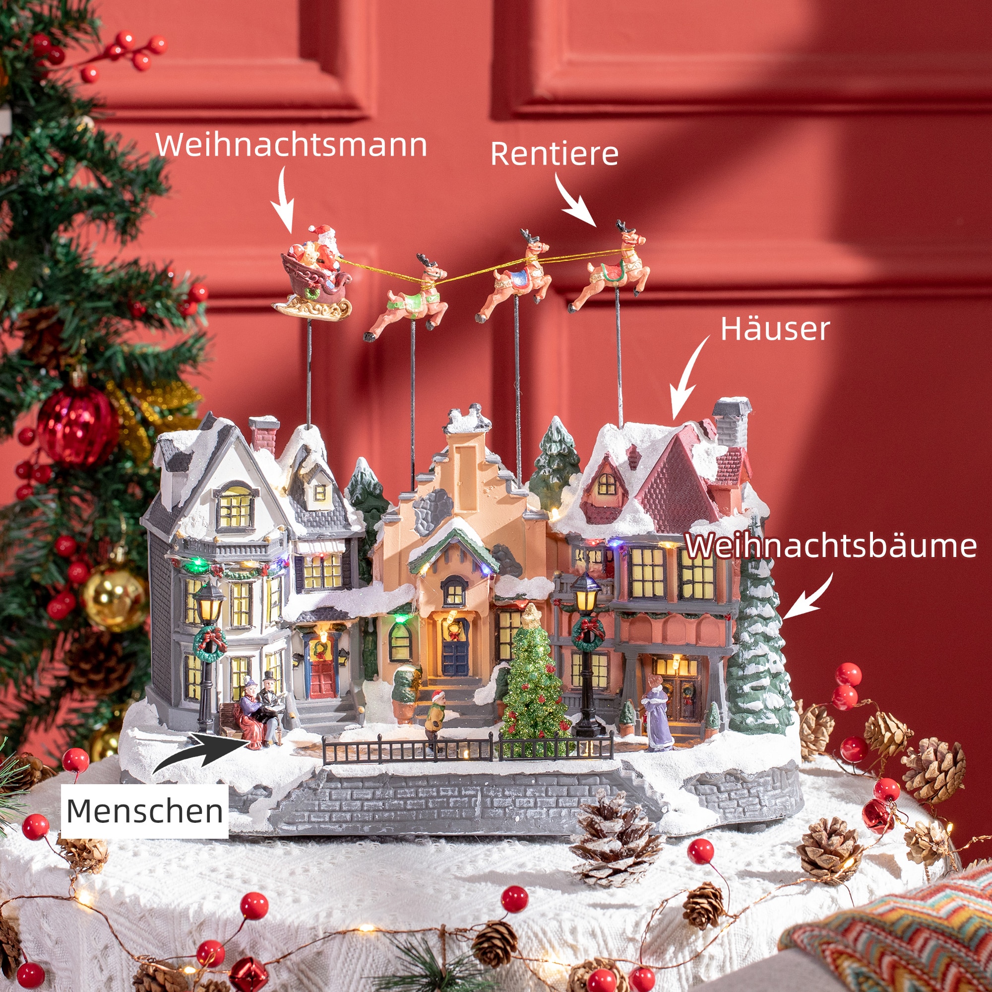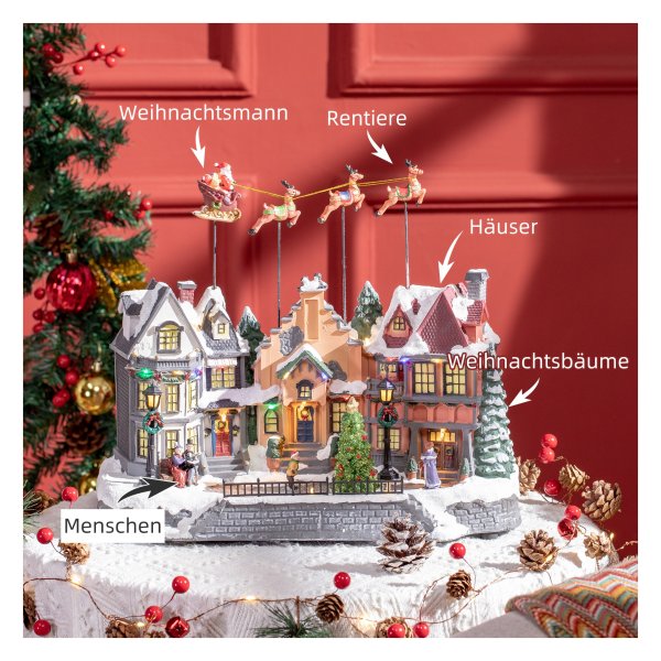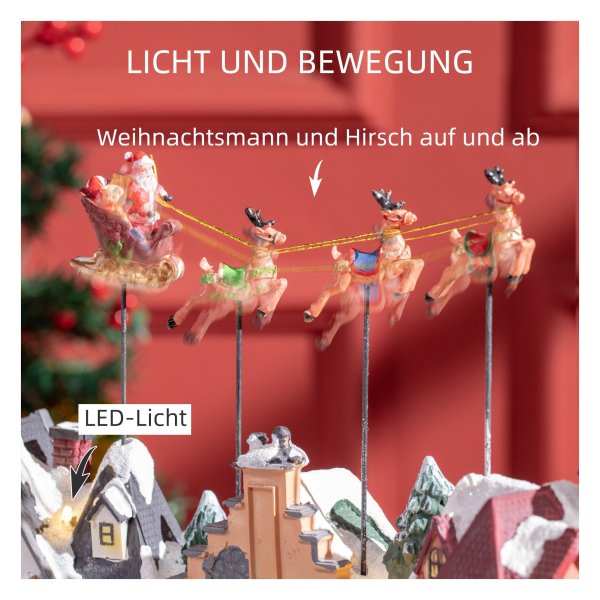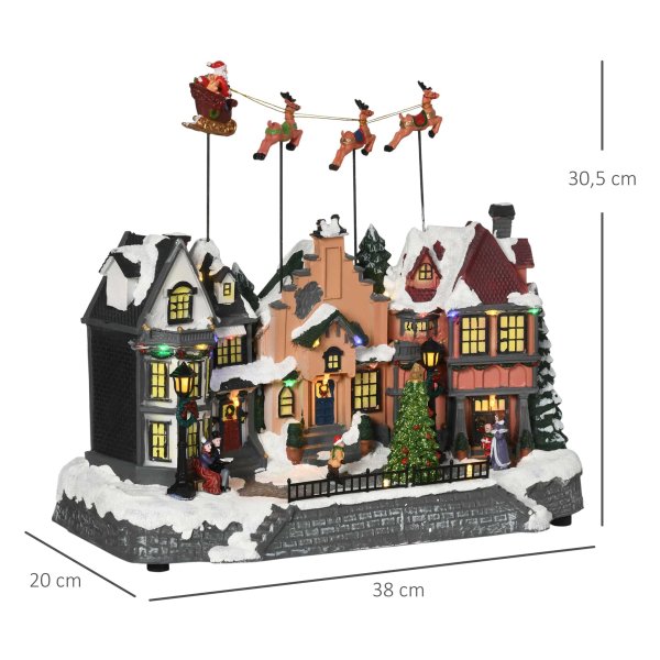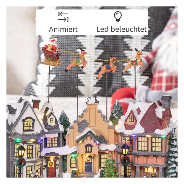 Bullet Point 1 | Kerstlandschap: deze met sneeuw bedekte, verlichte kerstdorp bevat drie huizen, kerstbomen, kerstman, rendier, slee, mensen en nog veel meer details |