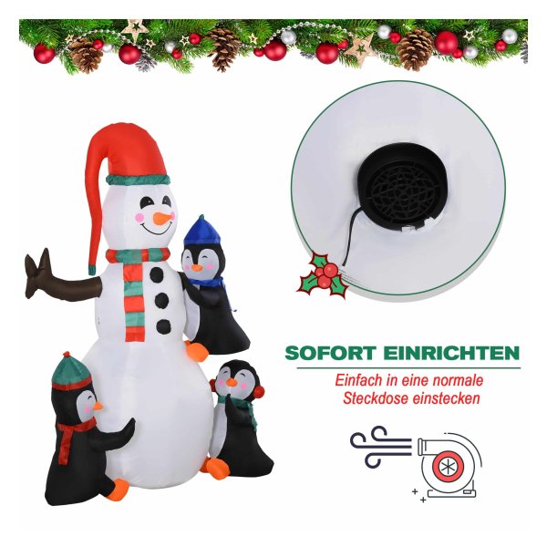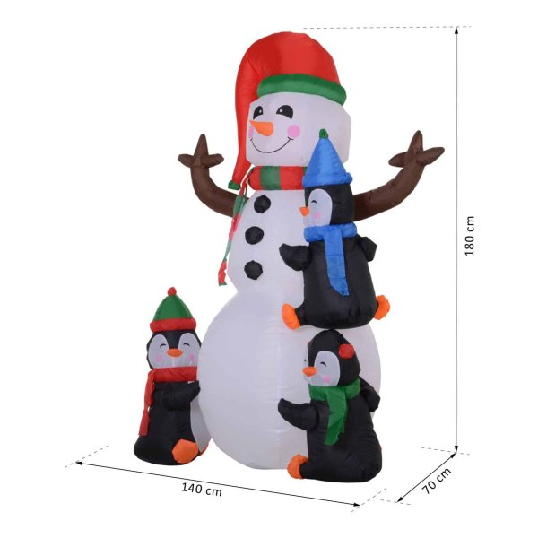 De opblaasbare sneeuwpop van MerryXmas is maar liefst 1,8 meter groot en wordt omringd door drie schattige pinguïns. Dankzij de LED-verlichting binnenin wordt de sneeuwpop ‘s avonds prachtig verlicht en zorgt hij voor een magische uitstraling in jouw tuin. De sneeuwpop is gemaakt van duurzaam en weerbestendig polyester, waardoor je er jarenlang plezier van zult hebben.