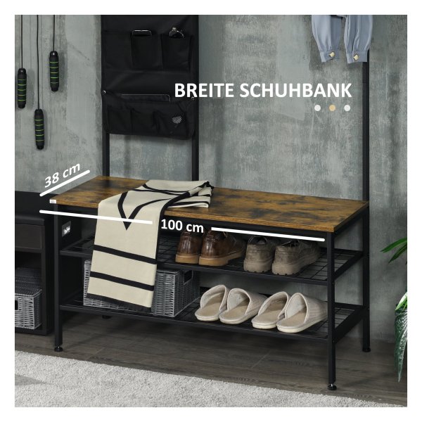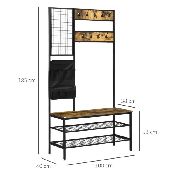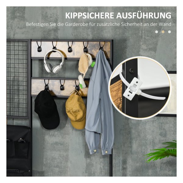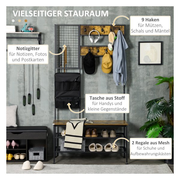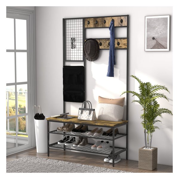Dit kapstokrek is voorzien van een handige schoenenplank, kledinghaken, een memobord en een opbergzak gemaakt van stevig Oxford-stof. Hang uw jassen, tassen en hoeden op aan de 9 stevige haken en berg kleine objecten op in de opbergzak met 6 kleine zakken en 1 grote tas.