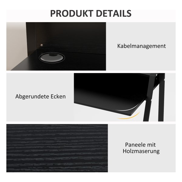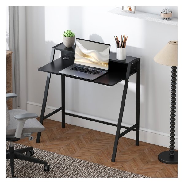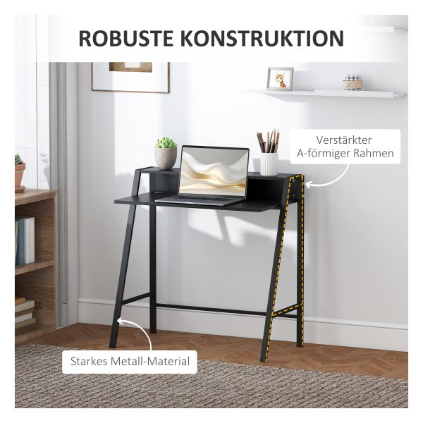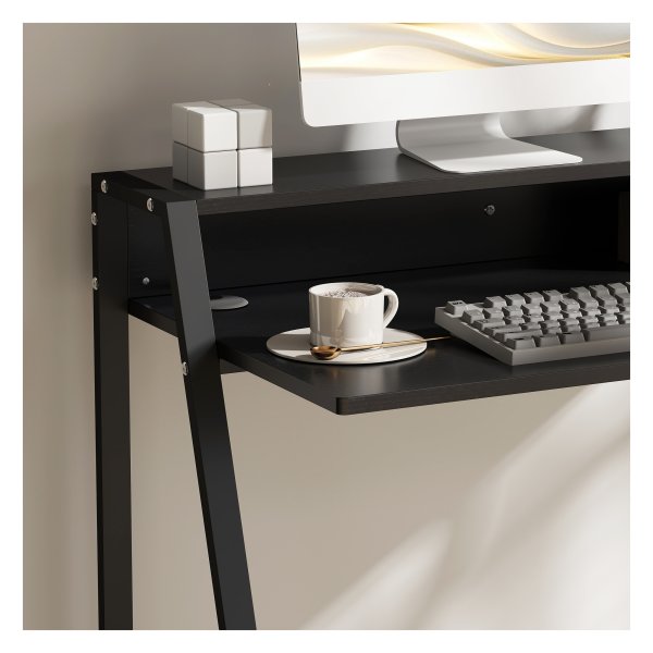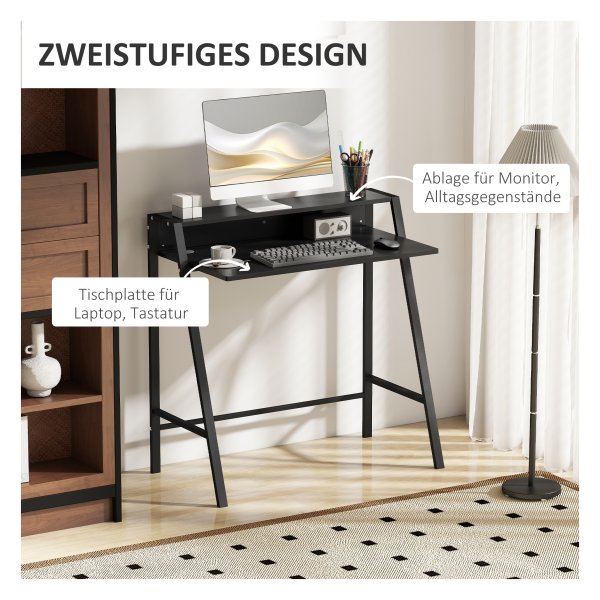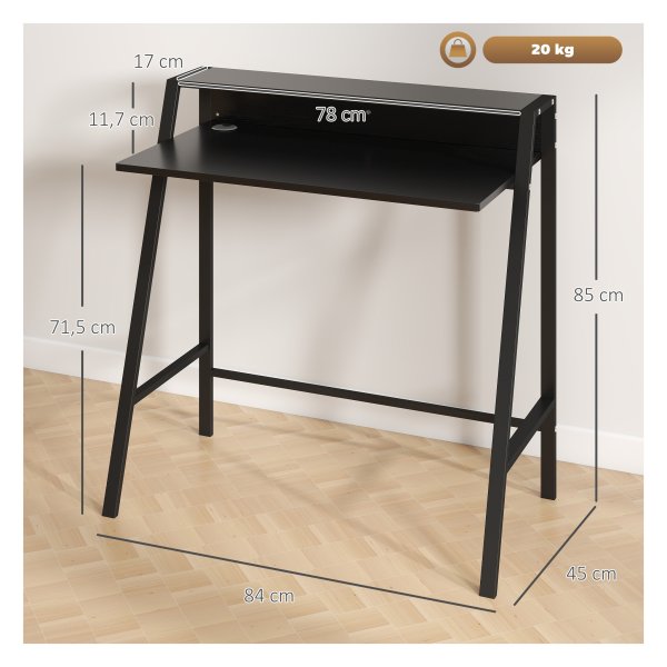 Met een zwarte kleur en materialen zoals MDF en metaal past dit bureau perfect bij elk interieur. De algemene afmetingen van 84L x 45B x 85H CM bieden voldoende werkruimte, terwijl de afmetingen van de plank (78L x 17B x 11.7H CM) extra opbergmogelijkheden bieden.