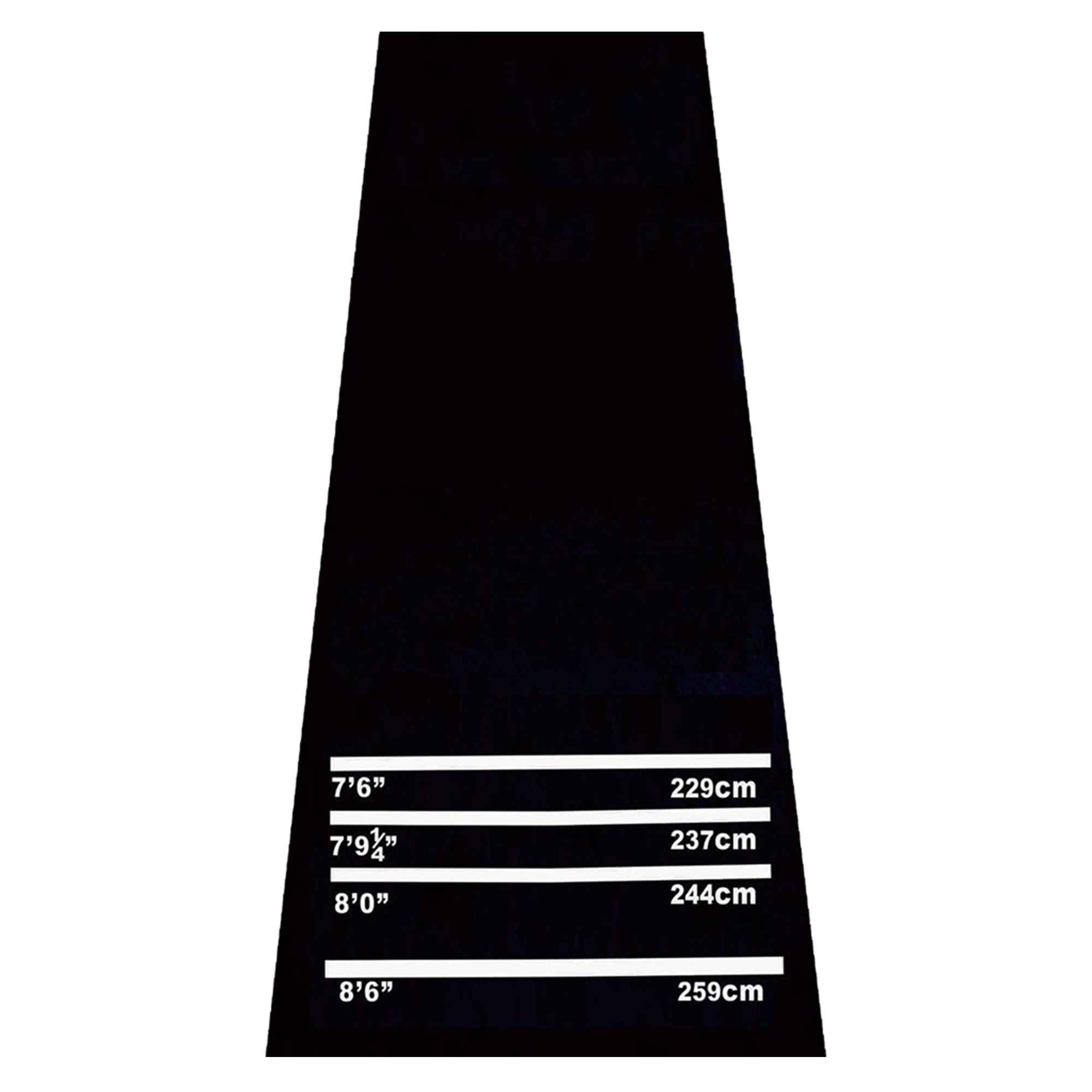 - Markeringen voor game distances: 7’6″ – 229 cm, 7’9 1/4″ – 237 cm, 8’0″ – 244 cm, 8’6″ – 259 cm