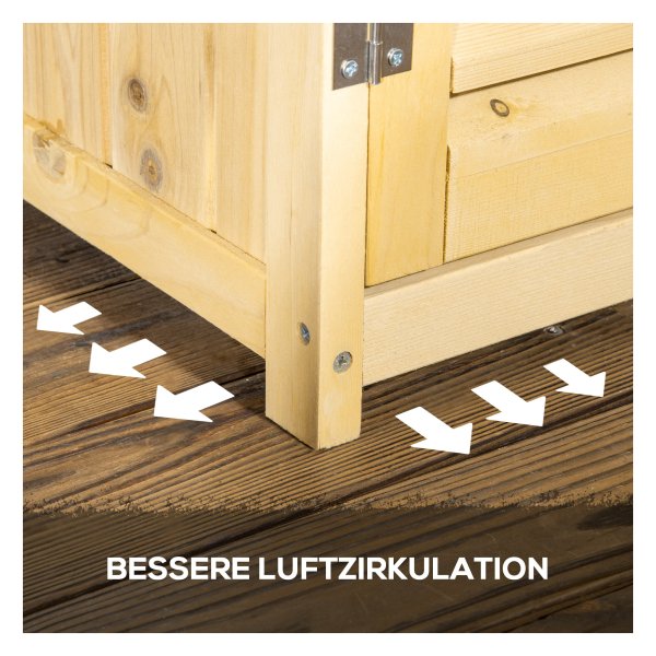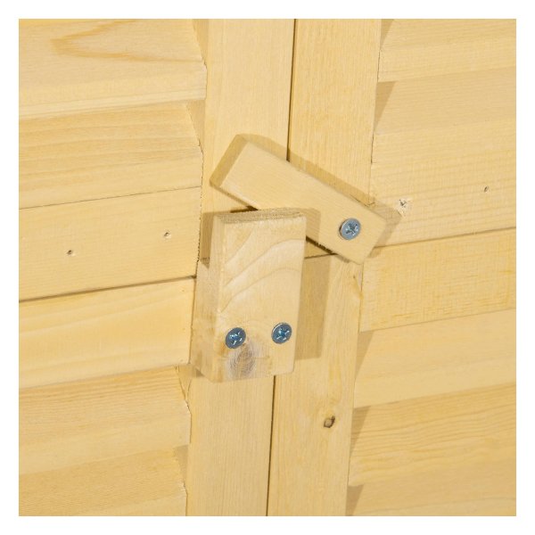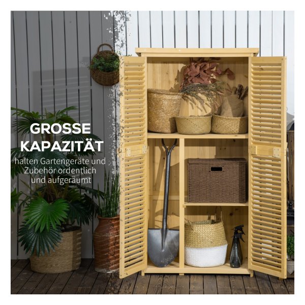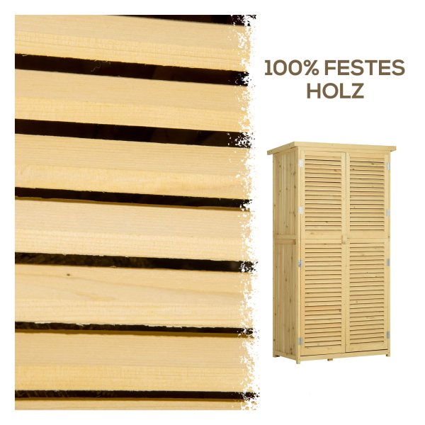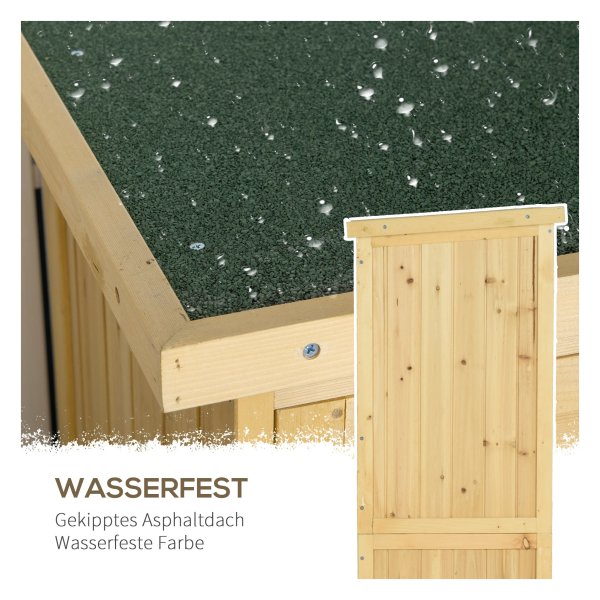 Het dak van de kast is versterkt met bitumen-sporen, waardoor deze bestand is tegen regenbuien en vocht. Hierdoor blijft uw tuingereedschap droog en goed beschermd tegen corrosie en roestvorming.