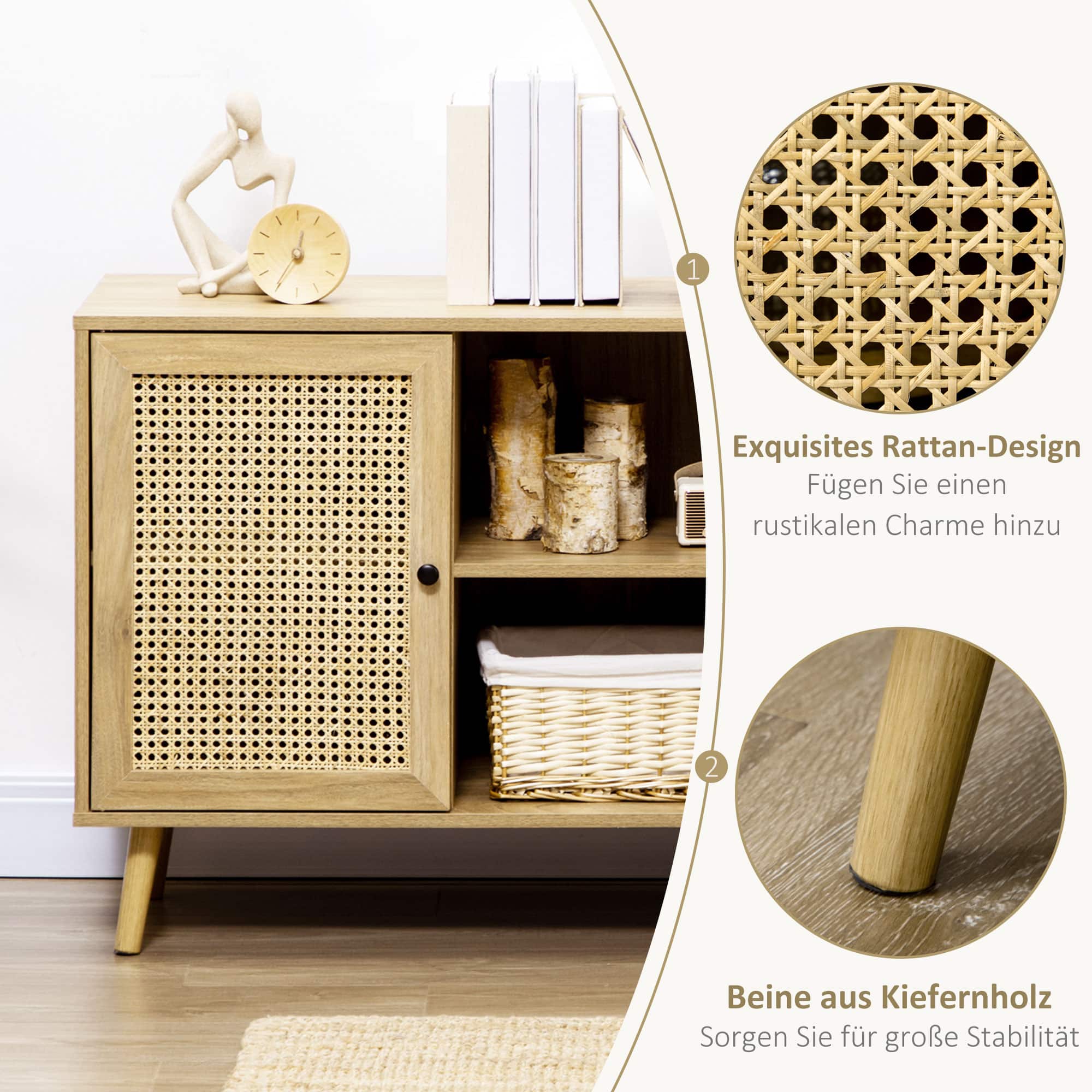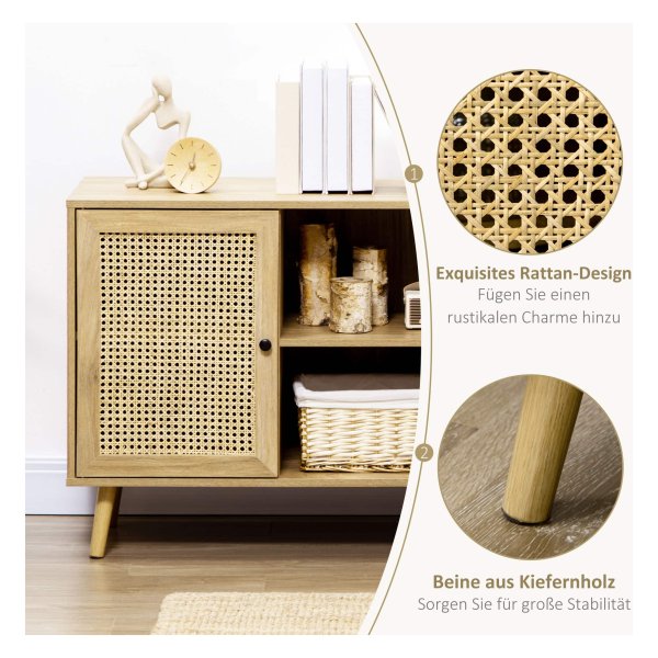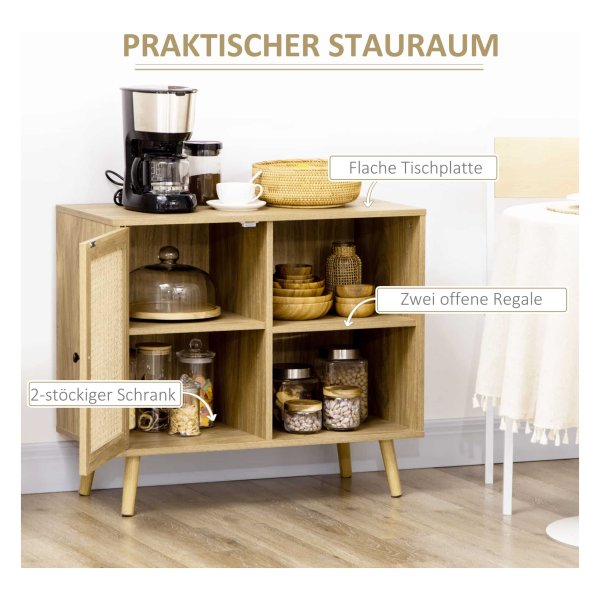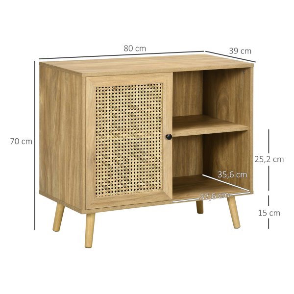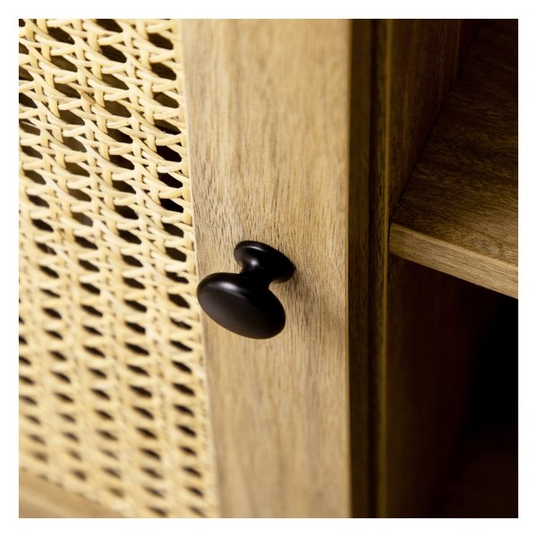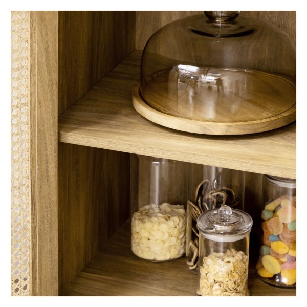 De keukenkast is uitgevoerd in een naturel kleur en is gemaakt van spaanplaat, rattan en dennenhout, wat zorgt voor een stijlvolle en natuurlijke uitstraling in jouw keuken. De afmetingen van de kast zijn 80L x 39B x 70H cm, met een open plank van 37.6L x 35.6B x 25.2H cm.