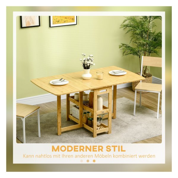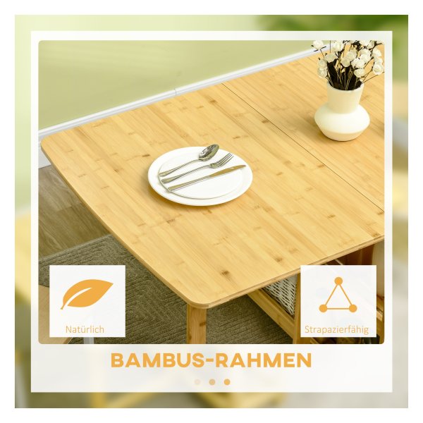 De eettafel is gemaakt van hoogwaardig bamboe, waardoor deze zeer stabiel en stevig is. Bamboe staat bekend om zijn duurzaamheid en natuurlijke uitstraling, waardoor je lang van deze tafel kunt genieten.