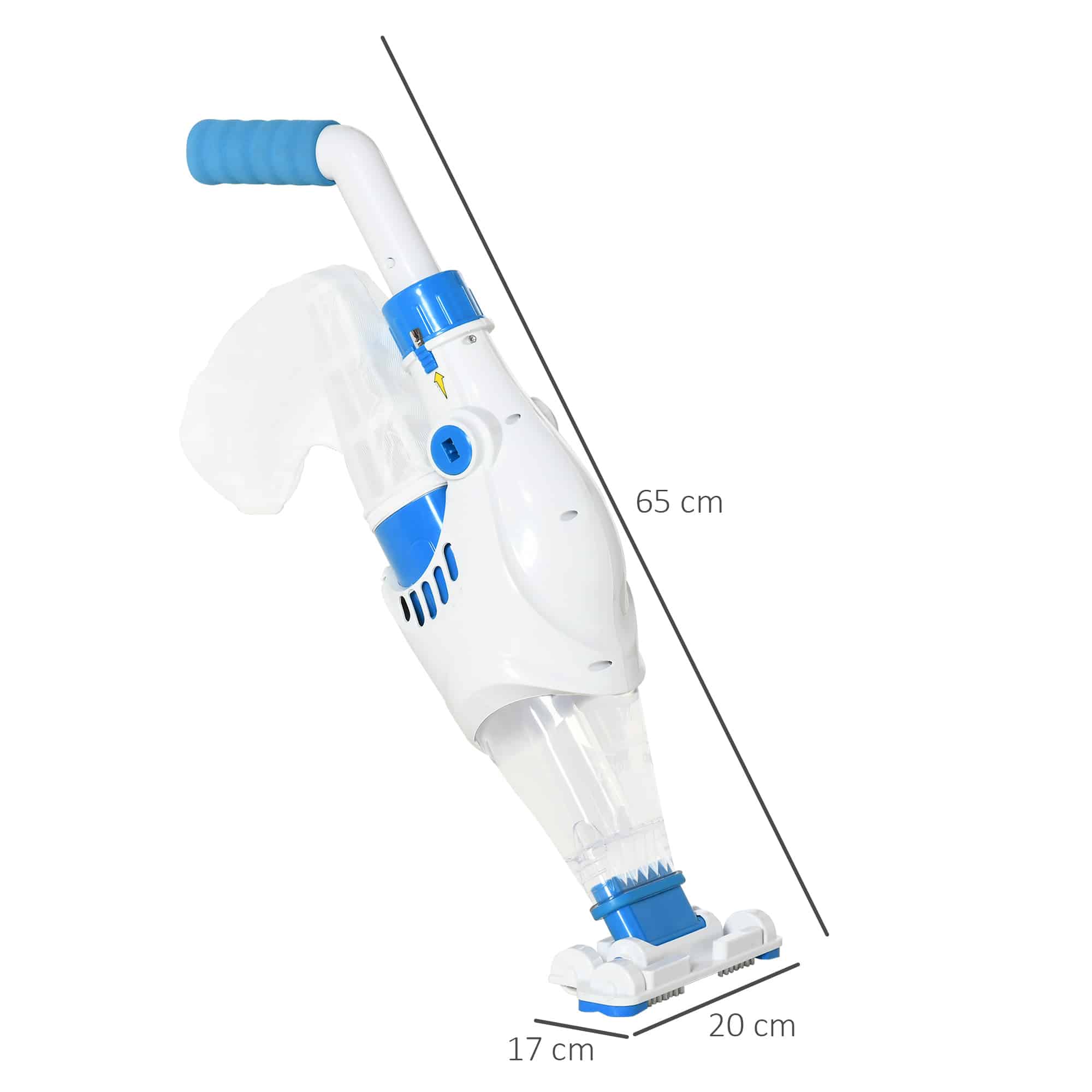 Deze zwembadstofzuiger is voorzien van een super head voor het grondig reinigen van hoeken en lastige plekken. Met totale afmetingen van 65L x 20B x 17H CM en een handvat van 21L x 14B x 3.5H CM is hij compact en gemakkelijk te hanteren. De montage is eenvoudig en vereist geen specialistische kennis.
