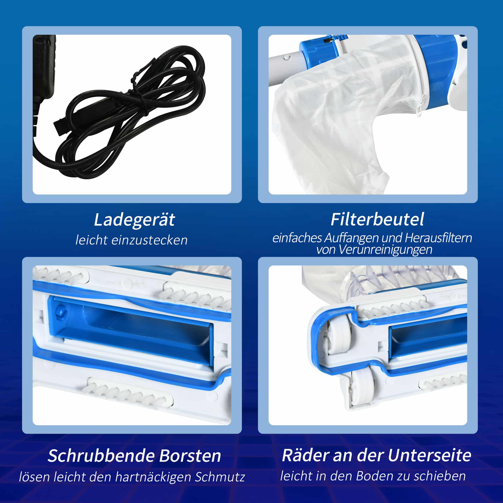 Deze innovatieve zwembadstofzuiger is ontworpen om moeiteloos bladeren, zaden, haar, zand en ander vuil van de hoeken van uw zwembad op te zuigen. Met 4 wielen aan de onderkant glijdt hij soepel over de bodem, waardoor u snel en efficiƫnt kunt schoonmaken. De onverharde filtertas zorgt ervoor dat verontreinigingen effectief worden opgevangen en gefilterd.