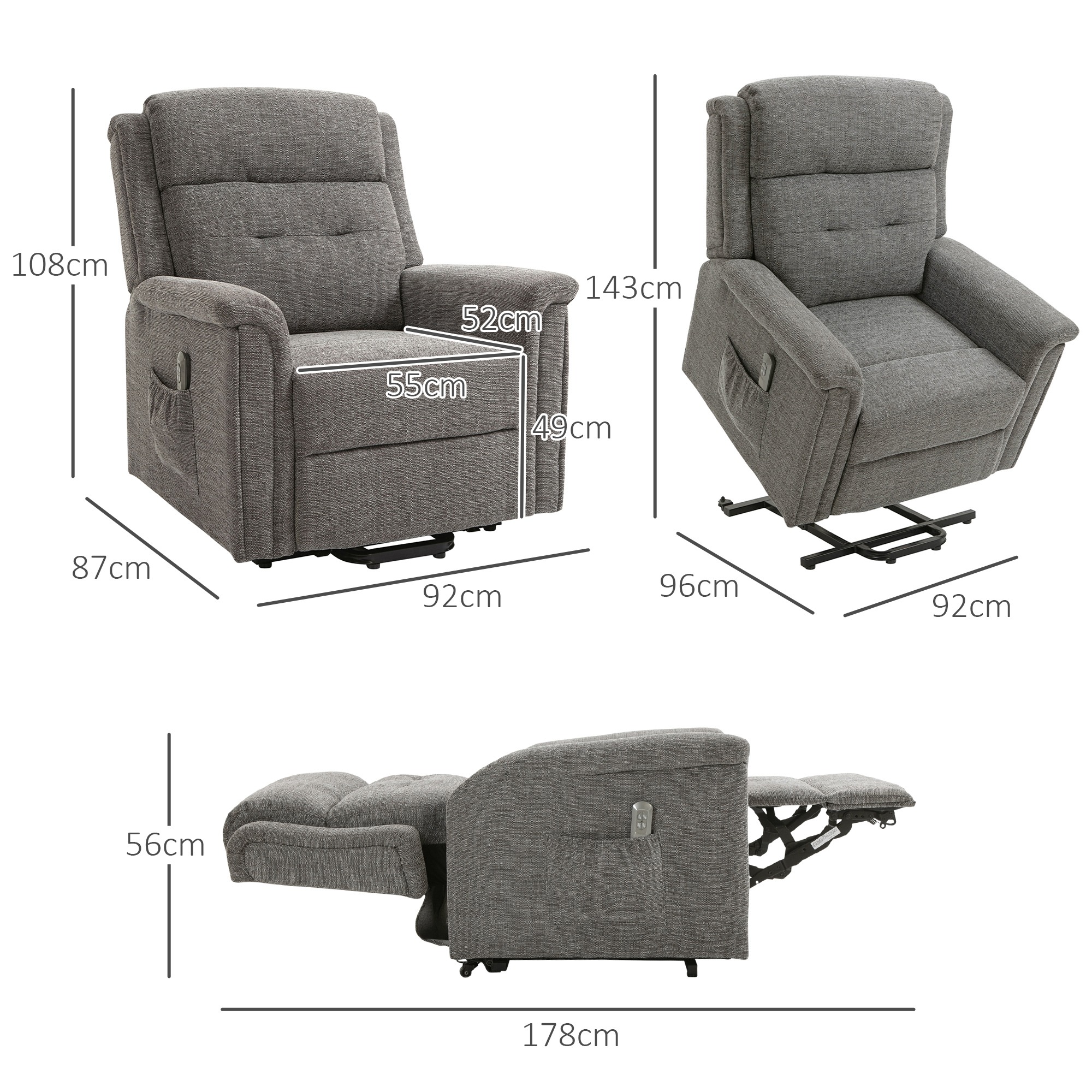 - De elektrische relaxfauteuil wordt geleverd met handige zijzakken voor het opbergen van accessoires, tijdschriften en afstandsbedieningen.
