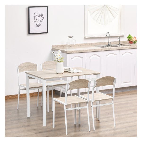 Deze 5-delige set bestaat uit een eettafel en vier bijpassende stoelen, ideaal voor kleinere ruimtes. Het compacte ontwerp biedt ruimte voor vier personen om comfortabel aan te zitten.
