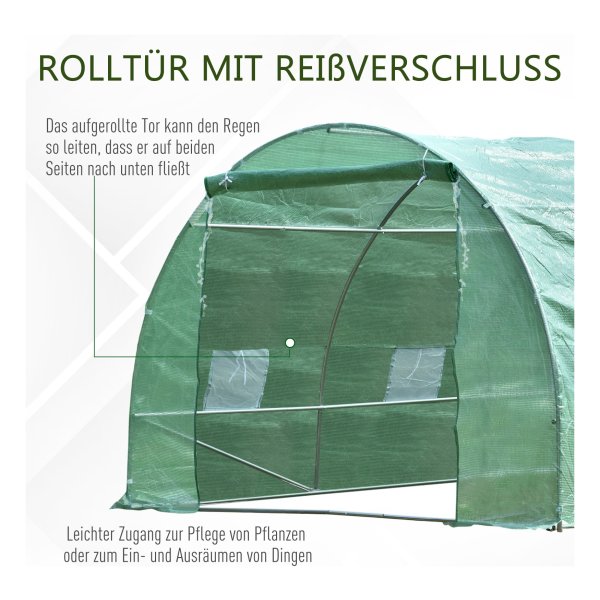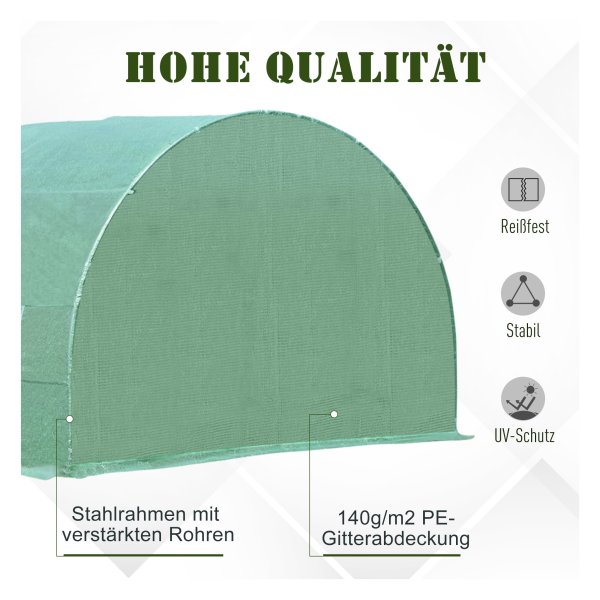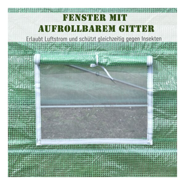 De kas is voorzien van een PE-netwerk raam voor goede ventilatie en is gemakkelijk te bevestigen met lijm tape. Let op: bij ernstige weersomstandigheden zoals sneeuwval, regen of wind, wordt aangeraden om de kashoes te verwijderen om beschadiging te voorkomen.