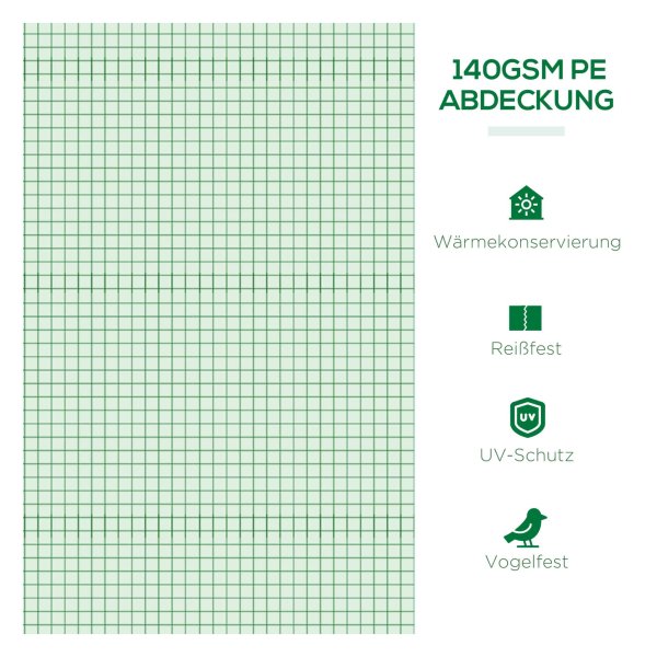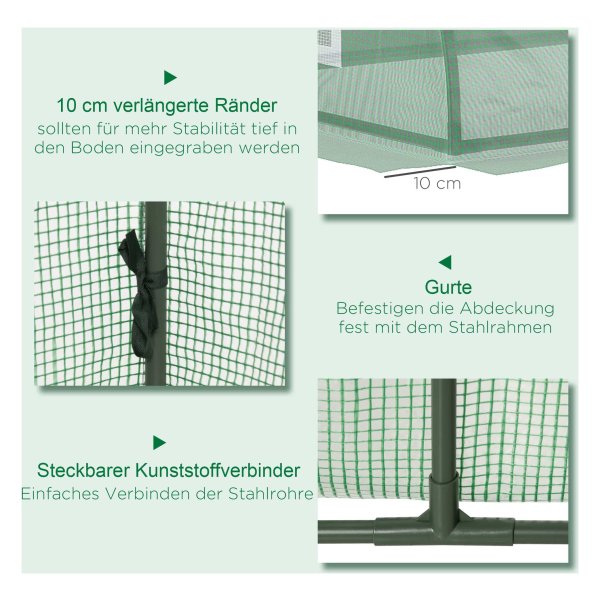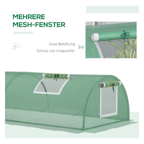 De UV-bestendige folie van de tunnelkas zorgt ervoor dat het vocht binnen blijft en je planten beschermd worden tegen schadelijke UV-straling. Tegelijkertijd wordt maar liefst 85% van het zonlicht doorgelaten, wat ideaal is voor de groei van je gewassen. Daarnaast zijn de ramen van de kas gemaakt van gaas, waardoor er een uitstekende luchtcirculatie plaatsvindt en ongewenste dieren zoals vogels buiten worden gehouden.