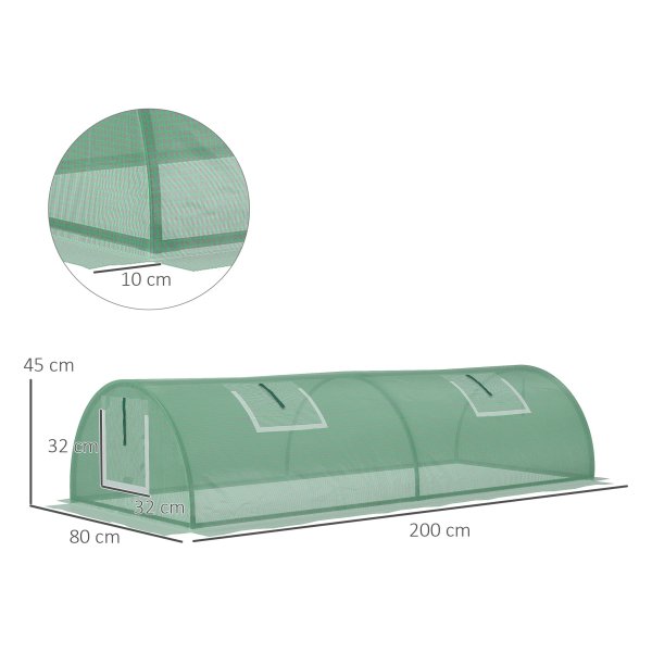 De tunnelkas heeft een mooie groene kleur en is gemaakt van duurzame materialen zoals staal, PE en PP. De afmetingen van de kas zijn 200L x 80B x 45H cm en elk venster heeft de afmetingen van 32B x 32H cm. Met een windsnelheidscategorie van niveau 4 (onder 17,5 mph) kan deze mini-kas tegen een stootje.