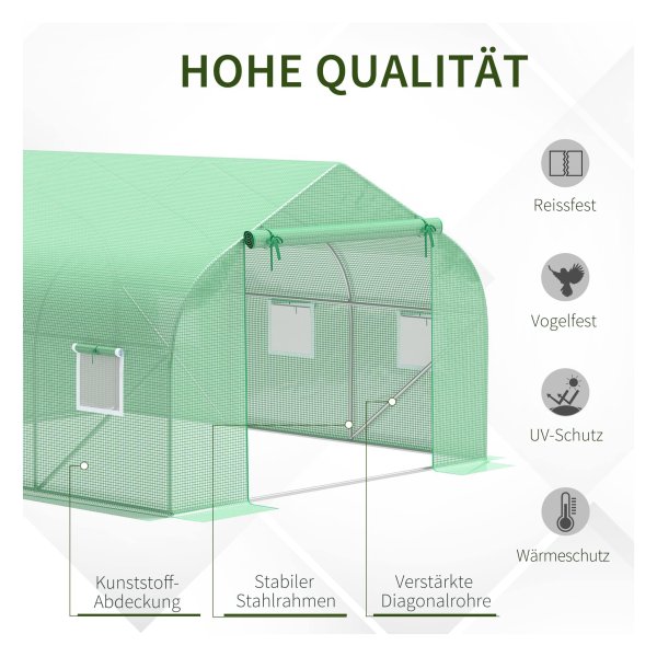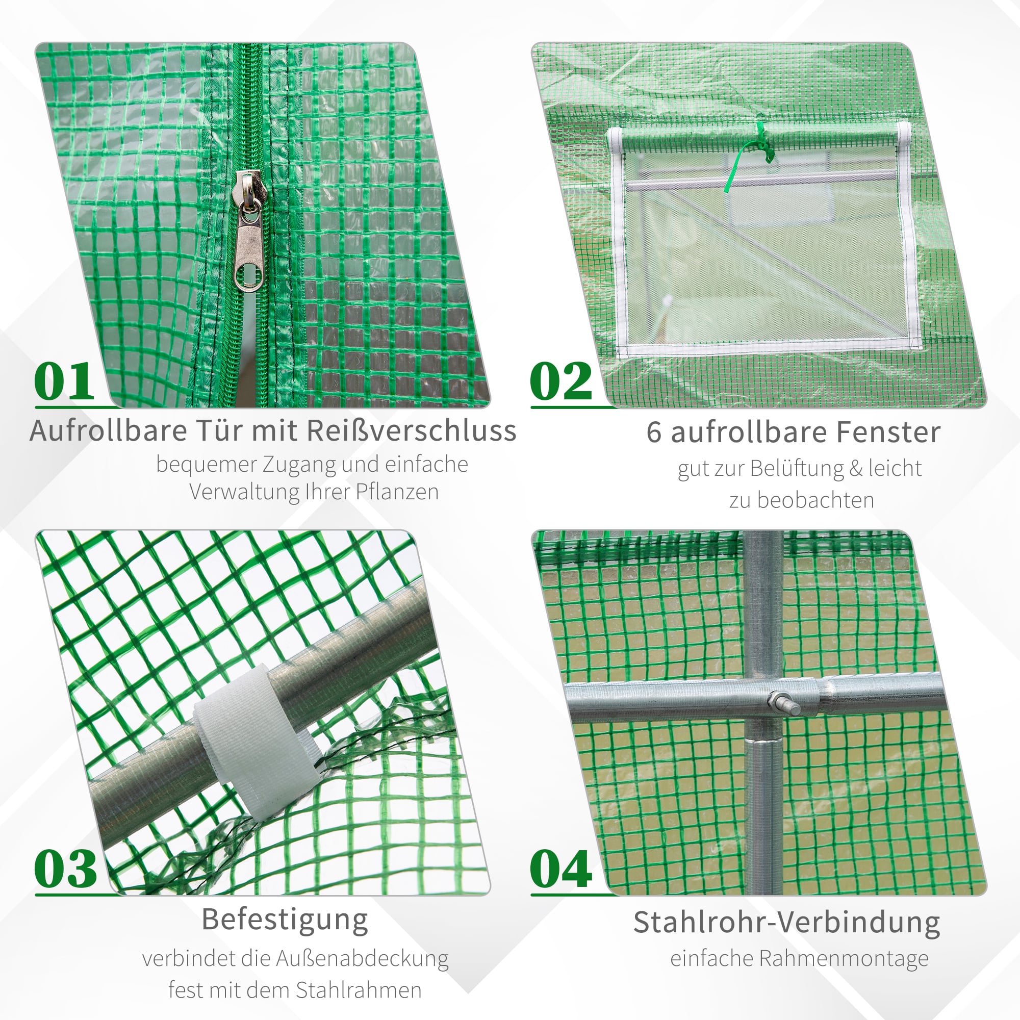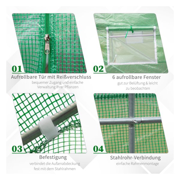De kas van Zaza Home biedt de ideale oplossing voor het beschermen van uw planten tegen koude, regen, vorst, wind en intense zonnestralen. Met een stabiel frame gemaakt van poeder gecoate metalen buizen en folie van UV-resistent PE-materiaal van 140 g/m², is deze foliekas van hoge kwaliteit en duurzaam in gebruik.