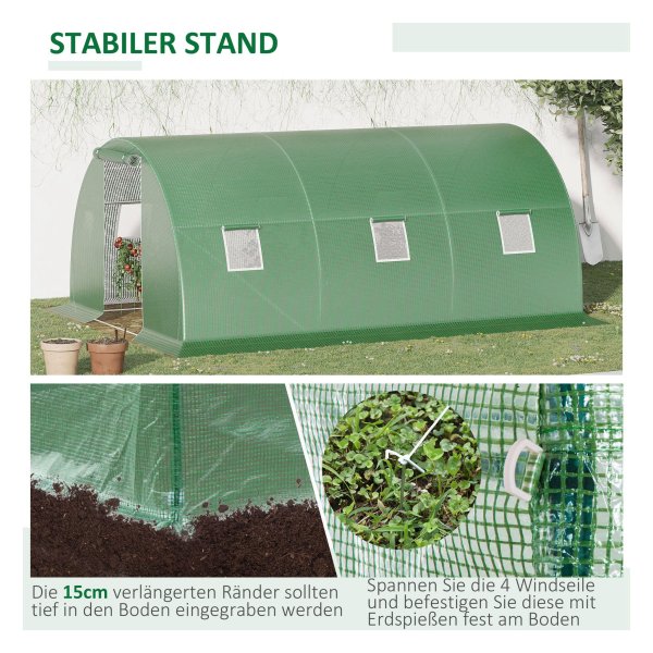 De langwerpige randen van de foliekas worden diep in de grond gegraven, waardoor extra stabiliteit wordt gegarandeerd, samen met de meegeleverde 4 windkabels en 4 grondankers. De montage van de kas is eenvoudig, maar vereist minimaal 2 personen om het frame op te zetten.