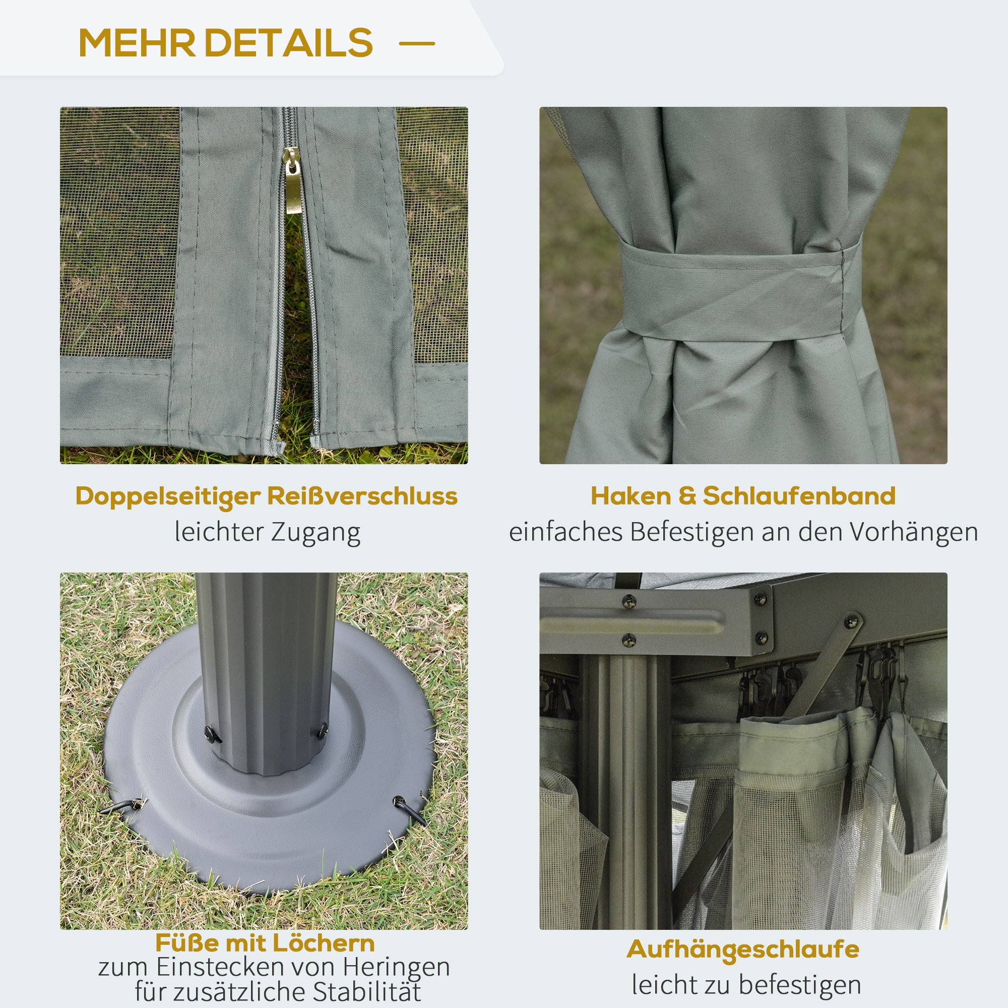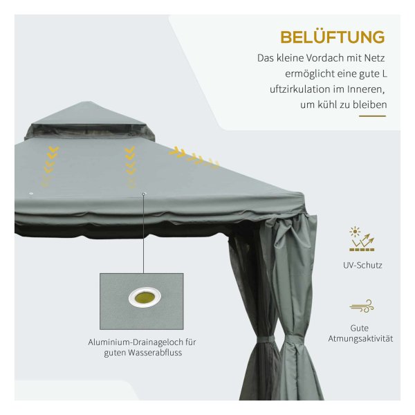 Daarnaast is de partytent voorzien van ventilatieopeningen in het dak voor een optimale luchtcirculatie, waardoor je altijd een comfortabele omgeving hebt, zelfs op warme dagen. De weerbestendige luifel met een PA-coating beschermt je tegen direct zonlicht, terwijl de verwijderbare zijwanden zorgen voor privacy en bescherming tegen insecten. Zo kun je ongestoord genieten van je tijd buiten, zonder afgeleid te worden door ongewenste elementen.