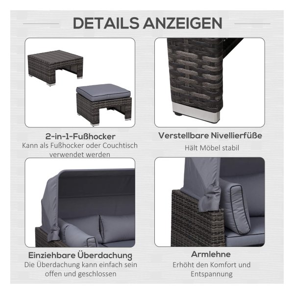 De Loungeset – Rattan zitgroep – Zonnedak – Metaalgrijs is volledig naar wens te configureren, zodat je je tuin een persoonlijk tintje kunt geven. De verstelbare voetmat zorgt voor een veilige grip, zelfs op ongelijke ondergronden, en maakt deze set geschikt voor elke tuin.