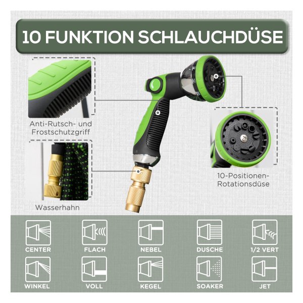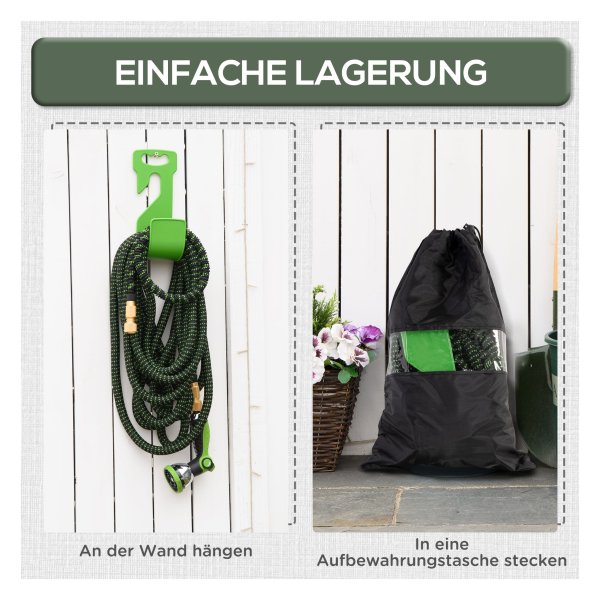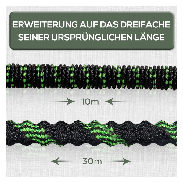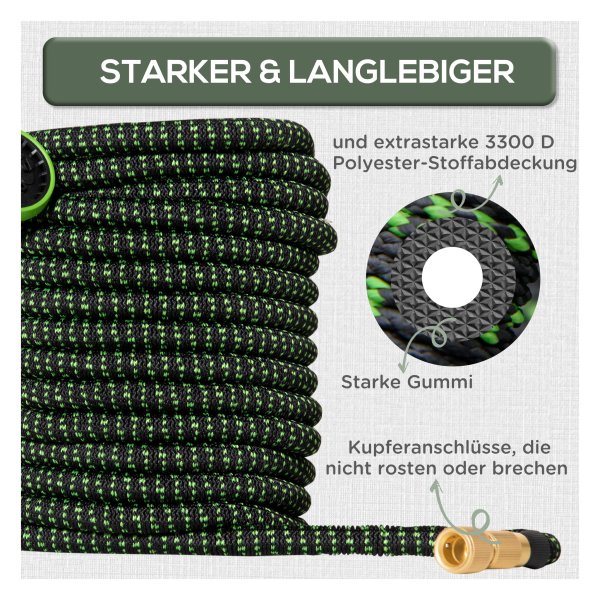 De tuinslang is voorzien van een elastische binnenkern van latex, wat zorgt voor maximale duurzaamheid en flexibiliteit. Na gebruik kun je het water eenvoudig uitzetten en de slang krimpt terug naar zijn oorspronkelijke grootte, zodat je hem gemakkelijk kunt opbergen.