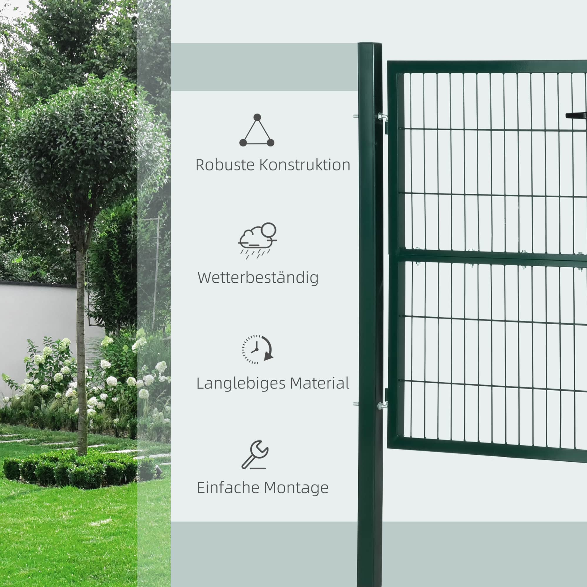 Het tuinhekwerk heeft een eenvoudig en stijlvol roosterontwerp dat zorgt voor een moderne uitstraling. Het robuuste stalen frame met roestvrijstalen fittingen zorgt voor een stabiele en duurzame constructie, waardoor jouw tuin optimaal beschermd is tegen de buitenwereld.