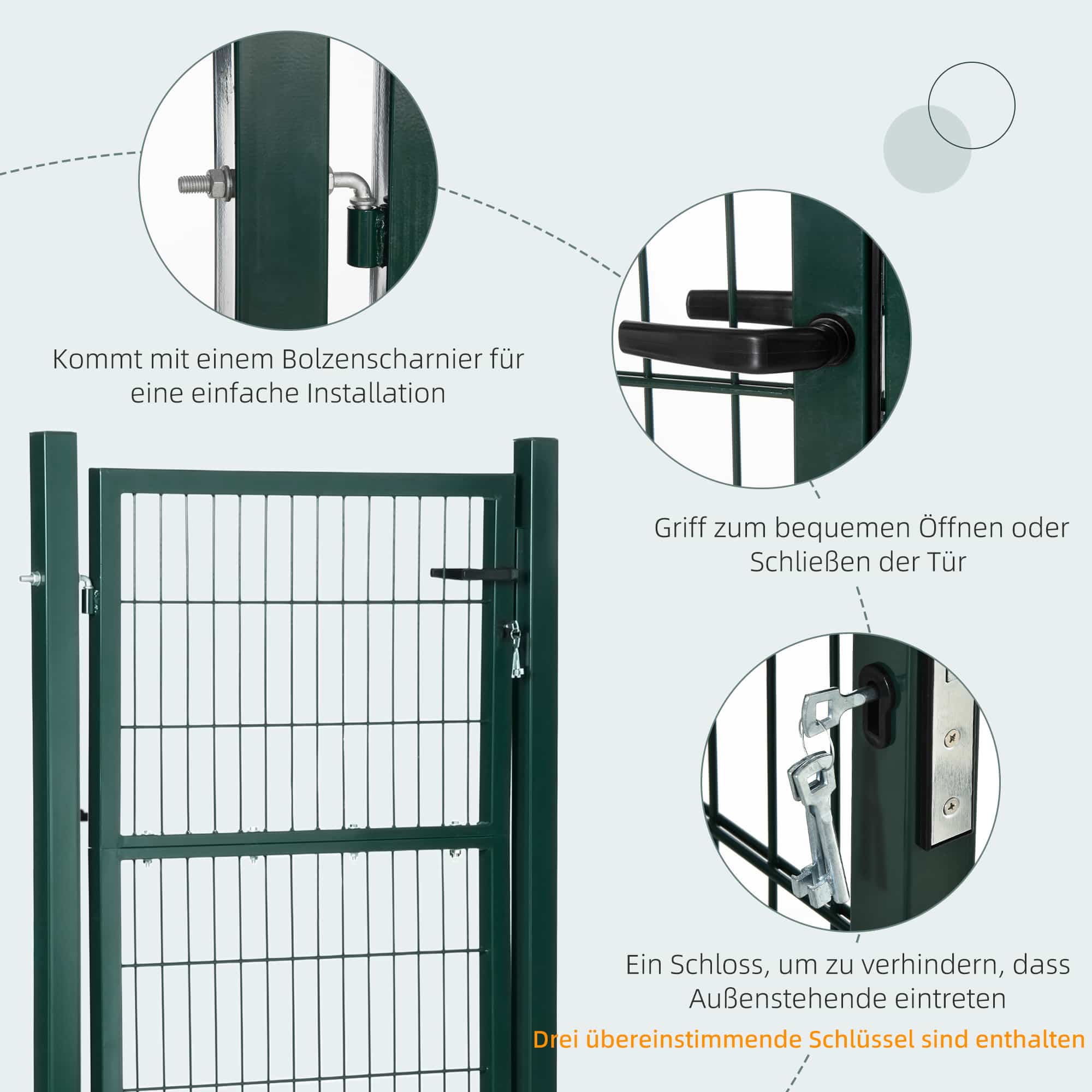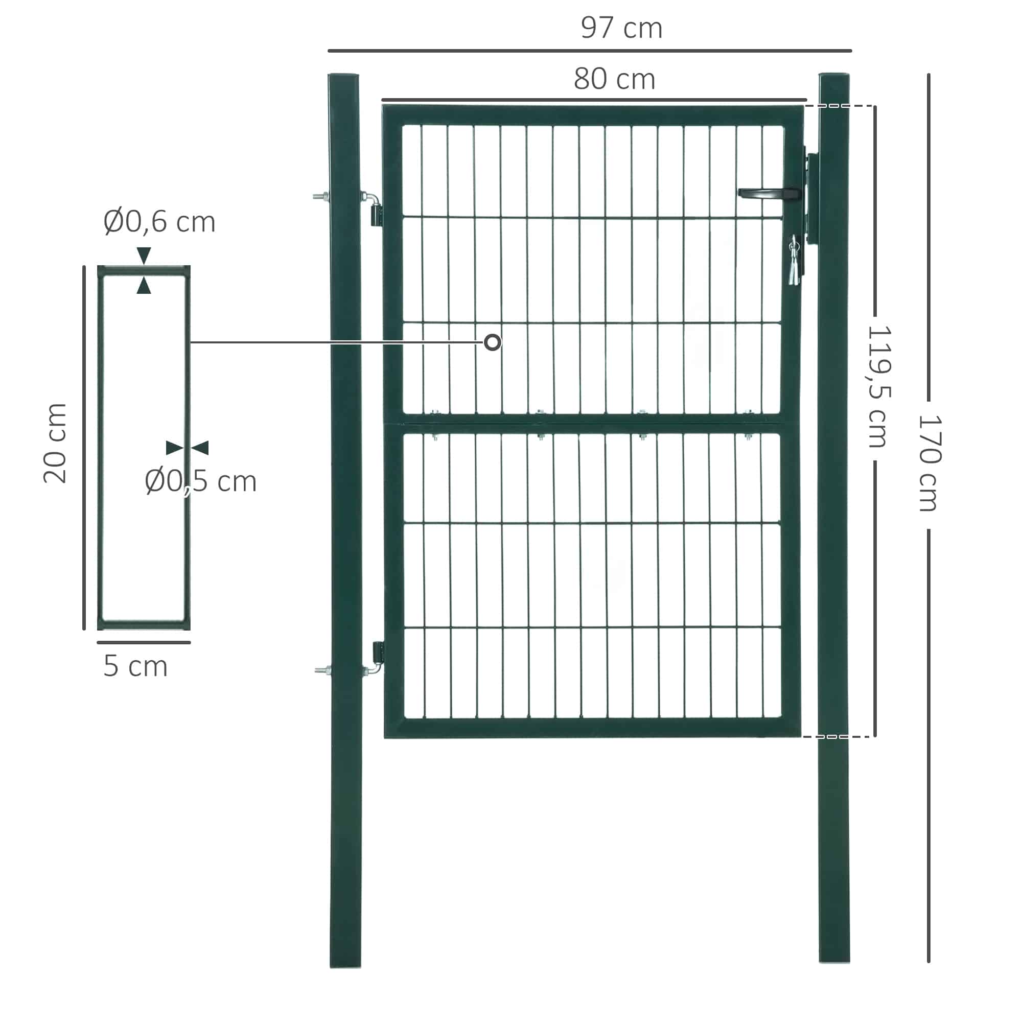 De tuinpoort wordt geleverd met een hoogwaardig slot dat wordt geleverd met drie bijpassende sleutels. Hierdoor ben je verzekerd van optimale beveiliging van jouw tuin of achtertuin. De stalen handgreep zorgt voor een comfortabele bediening en extra gemak bij het openen en sluiten van de poort.