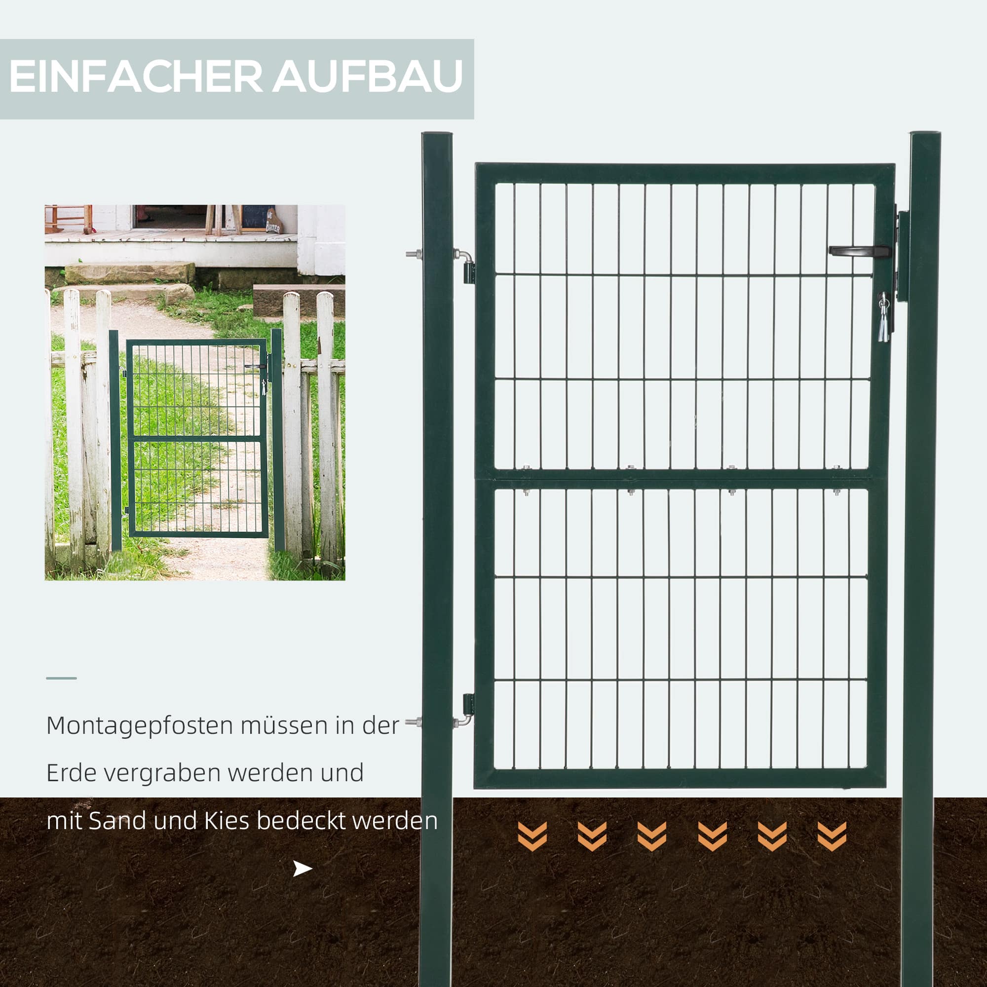 Het tuinhekwerk wordt geleverd met montagedelen voor eenvoudige bevestiging van het 40-45 cm inzetstuk. Daarnaast zijn er twee palen met stabiele scharnieren inbegrepen voor een moeiteloze installatie. De meegeleverde instructies maken de montage een eenvoudige klus die je snel kunt voltooien.