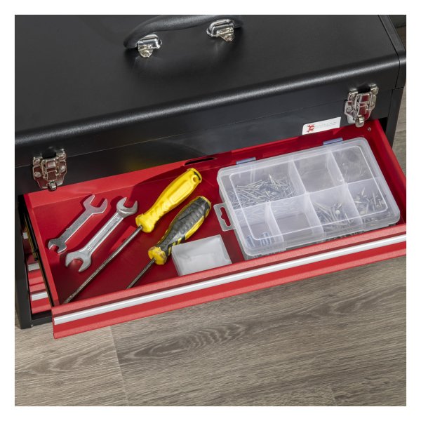 Deze kist is de ideale oplossing voor professionele vakmensen en doe-het-zelvers die hun gereedschap georganiseerd willen houden in garages, werkplaatsen en opslagruimtes. De kist wordt geleverd in een stoere zwart en rode kleur en heeft de volgende technische specificaties: