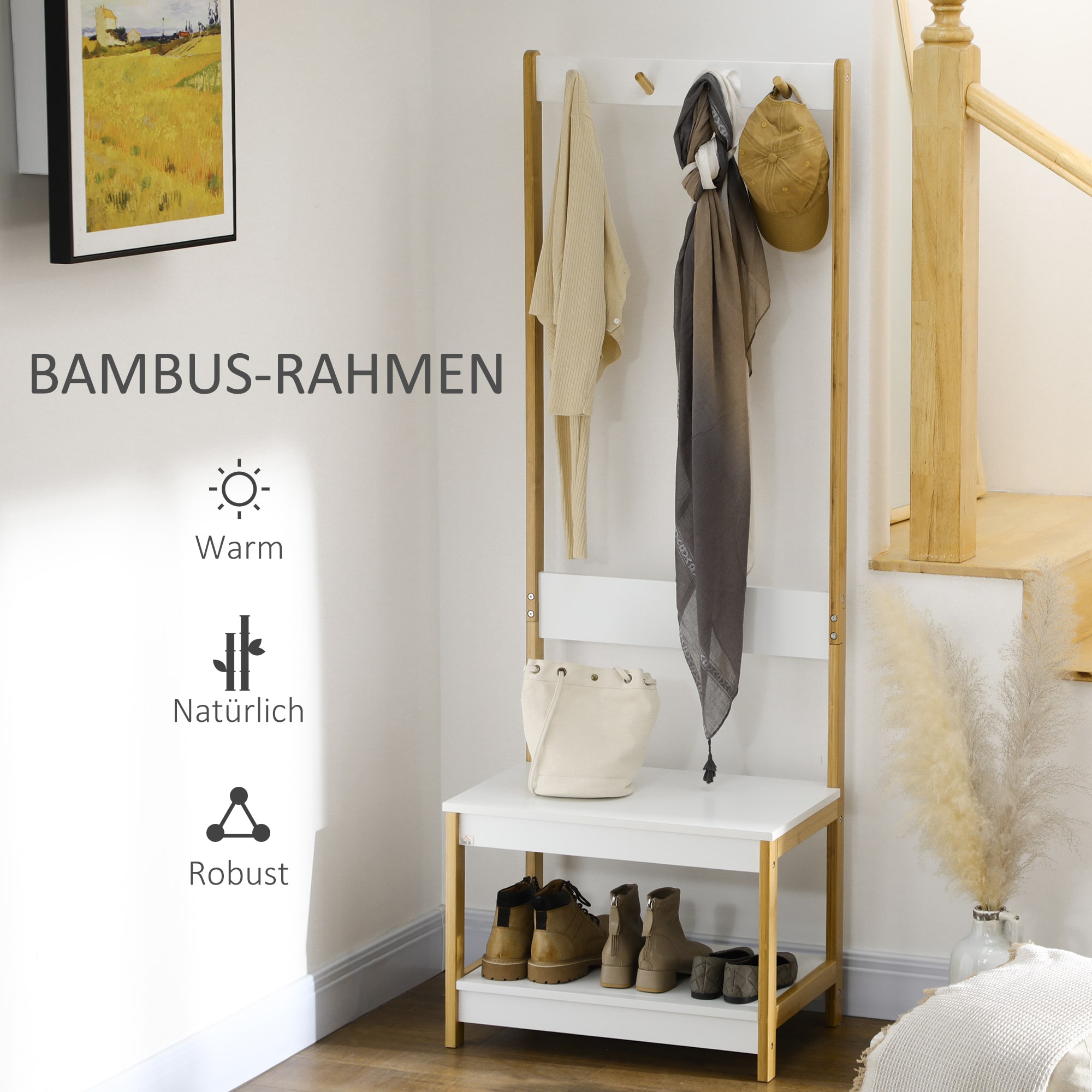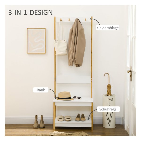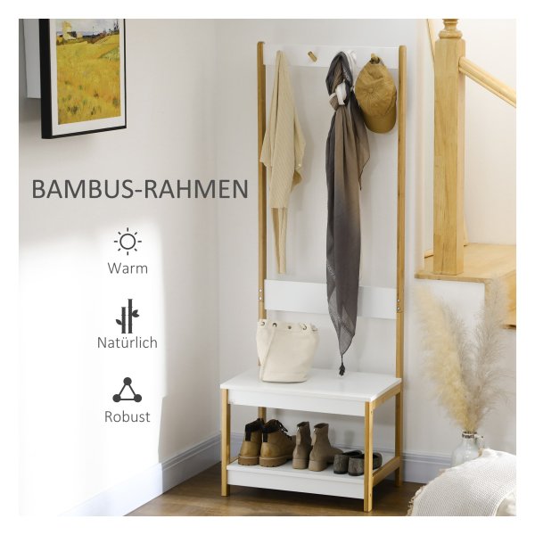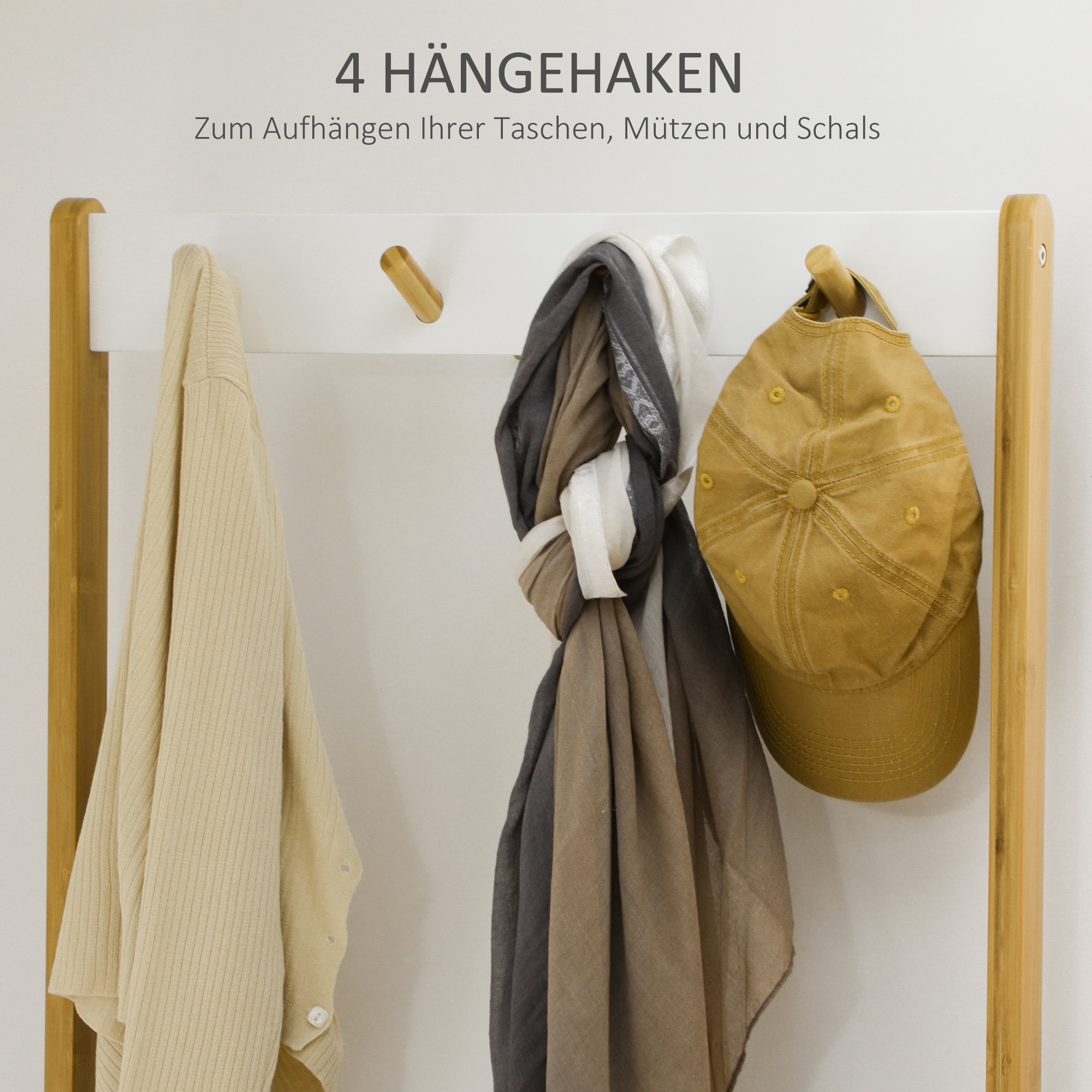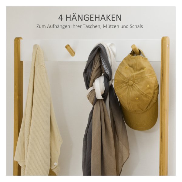 Het bamboe-frame van dit kledingrek past perfect bij verschillende interieurstijlen. De onderste plank biedt ruimte voor maximaal 3 paar schoenen (EU-maat: 43), zodat je gemakkelijk van schoeisel kunt wisselen terwijl je zit. Daarnaast zijn er 4 stabiele haken voor het ophangen van je hoeden, tassen en sjaals, waardoor je alles georganiseerd kunt houden.