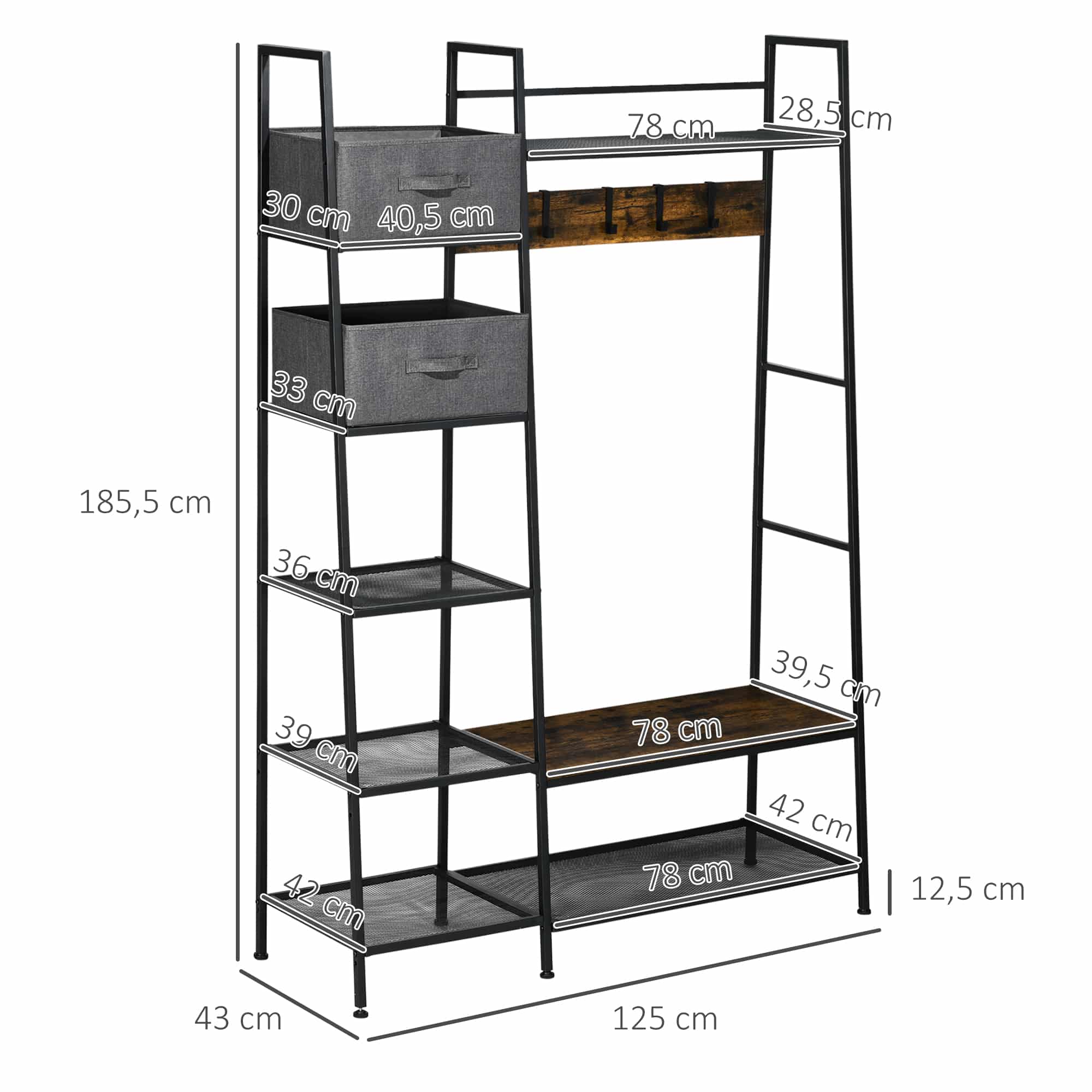 - Draagvermogen: 111 kg totaal, 75 kg (bank), 8 kg (bovenste/onderste planken), 3 kg (elke roosterplank), 1 kg (elke haak)