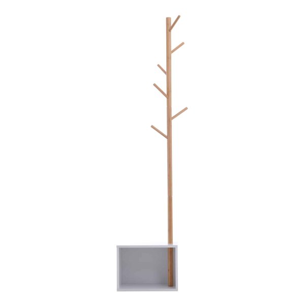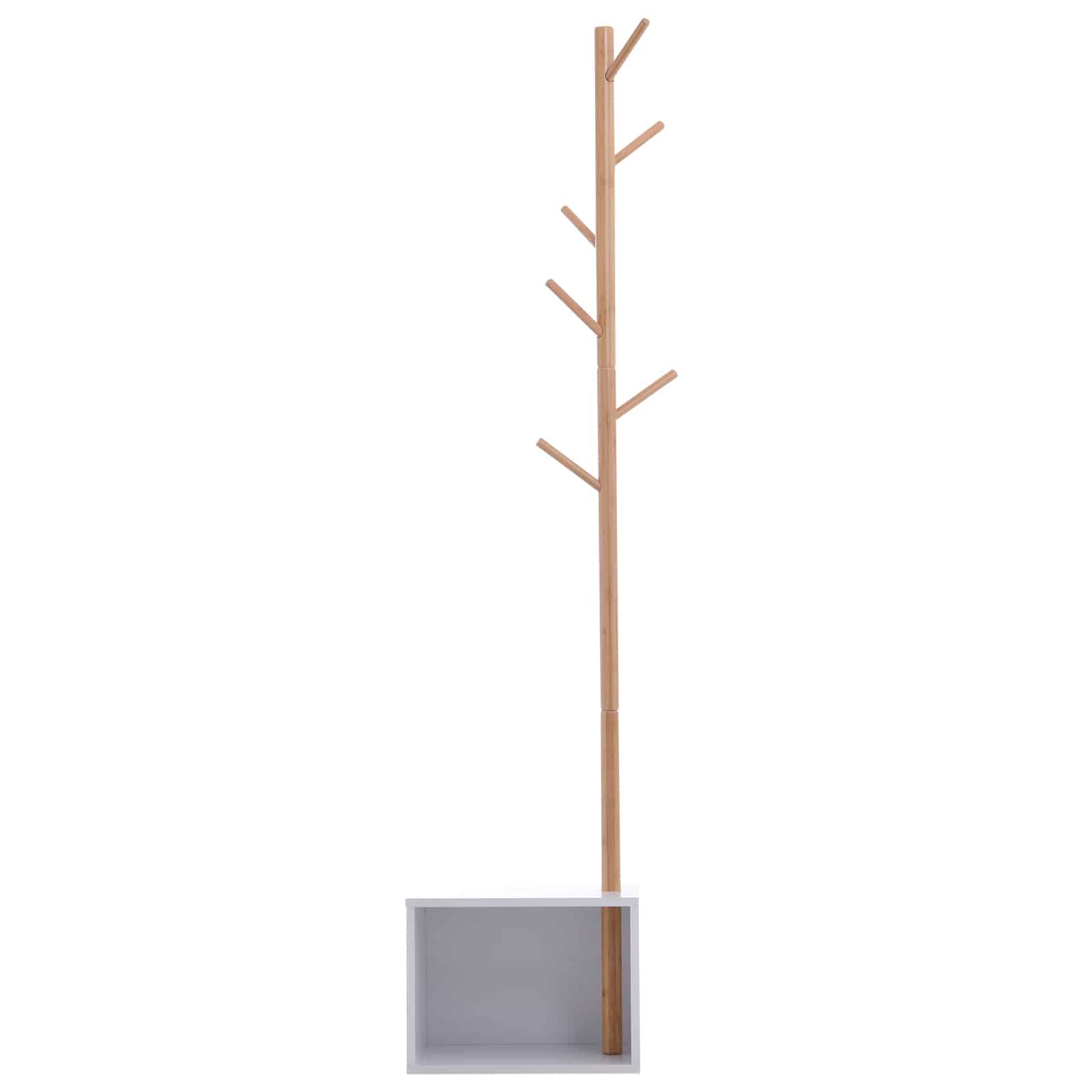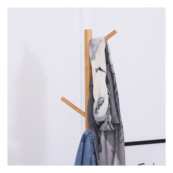 De garderobe is vervaardigd uit robuust bamboe en MDF, waardoor deze duurzaam en stabiel is. Met zes takken biedt het rek voldoende ruimte voor al uw favoriete kledingstukken, van jassen en mantels tot sjaals en accessoires.