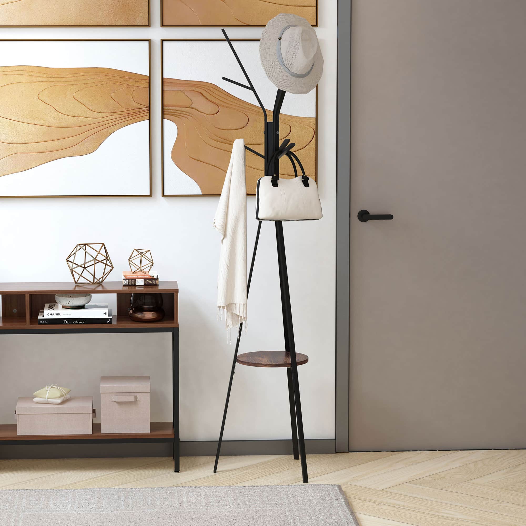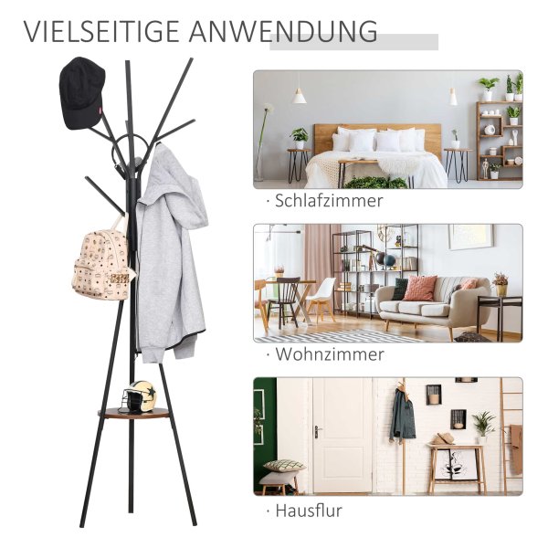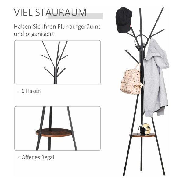De zwarte en bruine kleurencombinatie geeft deze kledingorganizer een moderne uitstraling die perfect past in elke ruimte. Het slimme en ruimtebesparende ontwerp zorgt ervoor dat u optimaal gebruik kunt maken van de beschikbare ruimte, zelfs in een kleine hal of kledingkast. Daarnaast is de organizer gemakkelijk schoon te houden en zeer stabiel dankzij het stevige metalen frame en MDF-hout.