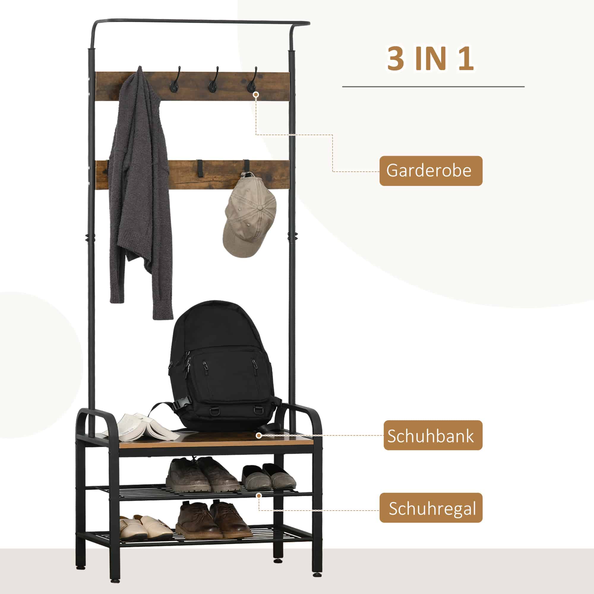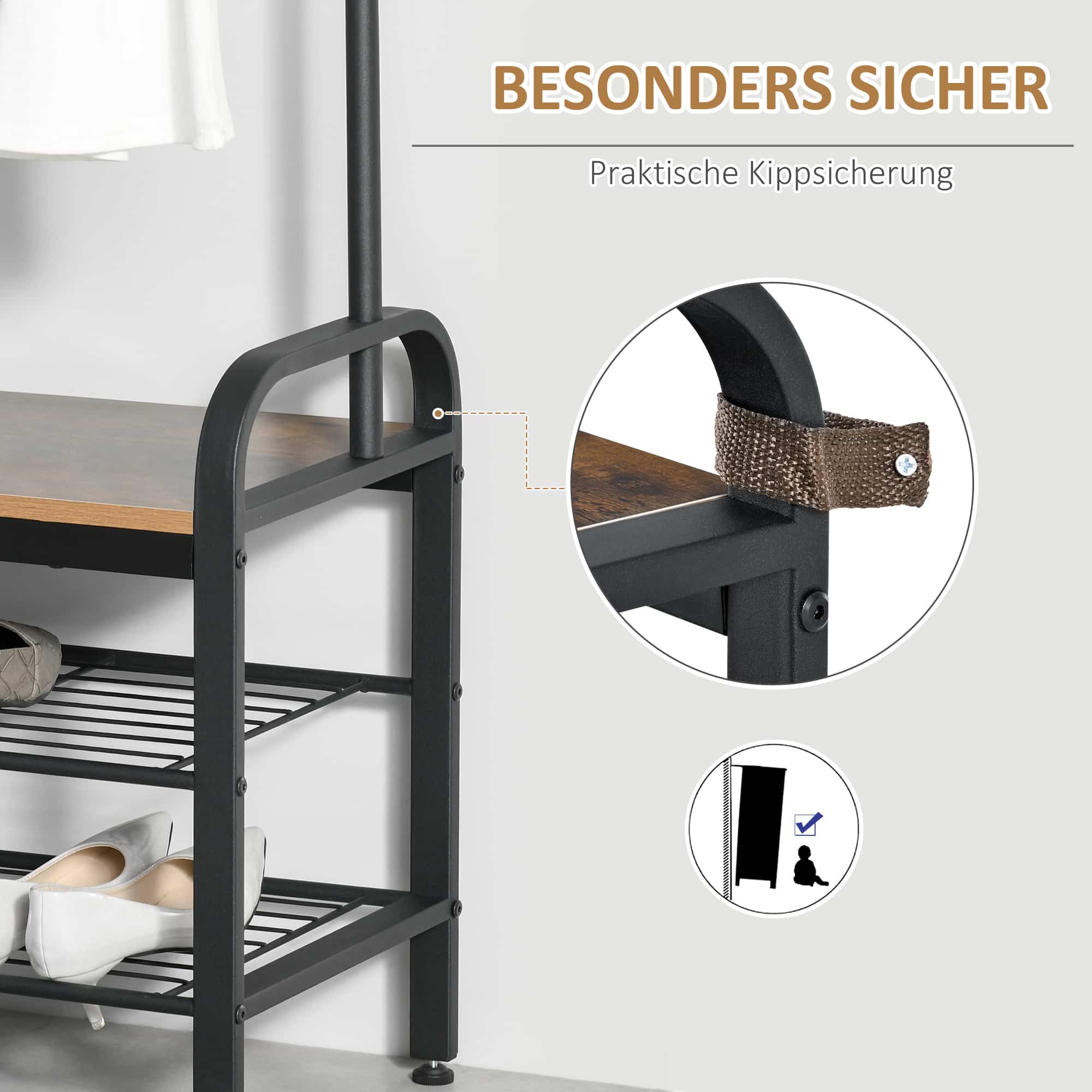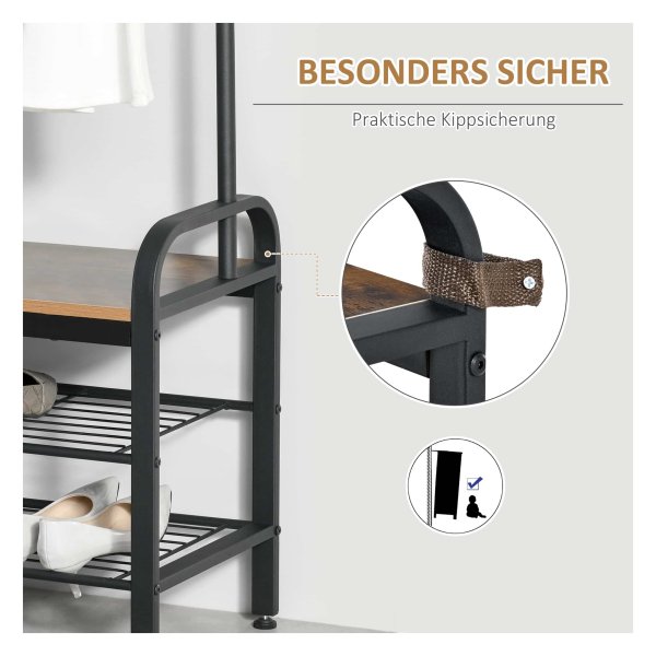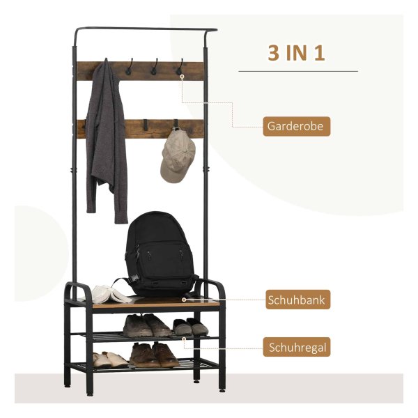 Niet alleen is dit multifunctionele rek ideaal voor het opbergen van schoenen, jassen, tassen en meer, het kan ook dienen als een handig zitoppervlak. Dankzij de vier verstelbare voeten staat het rek altijd stabiel, zelfs op ongelijke vloeren.