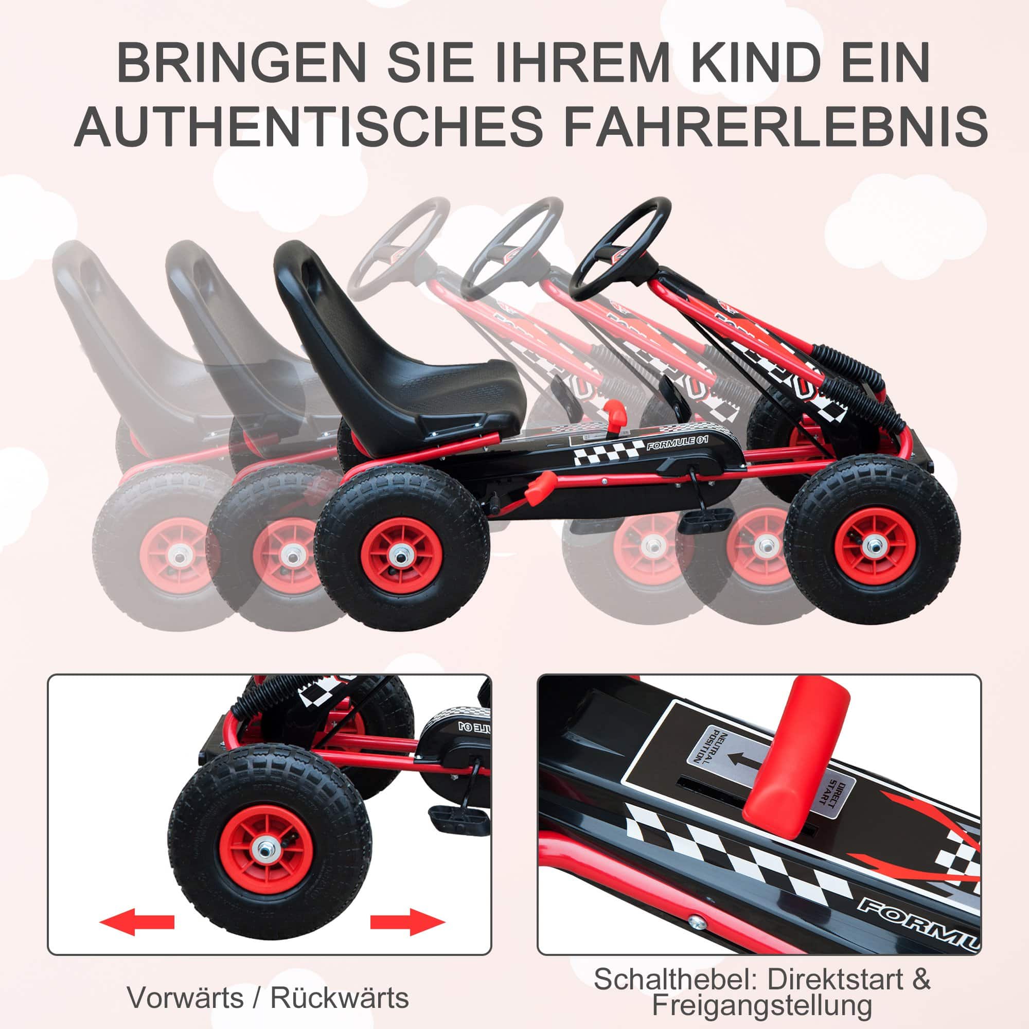 De trapauto is voorzien van een schakelhendel met twee standen, waardoor je kunt kiezen tussen “Direct Start” voor pedaalbediening of “Neutraal” voor gemakkelijk duwen zonder dat de pedalen draaien. Daarnaast is de stoel verstelbaar en zijn er handremmen op zowel het achterwiel als het mechaniek voor en achter, waardoor je kind altijd veilig kan rijden.