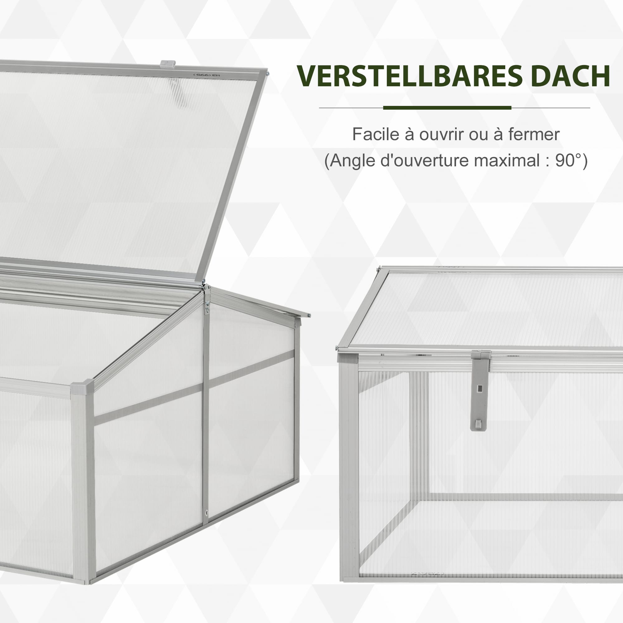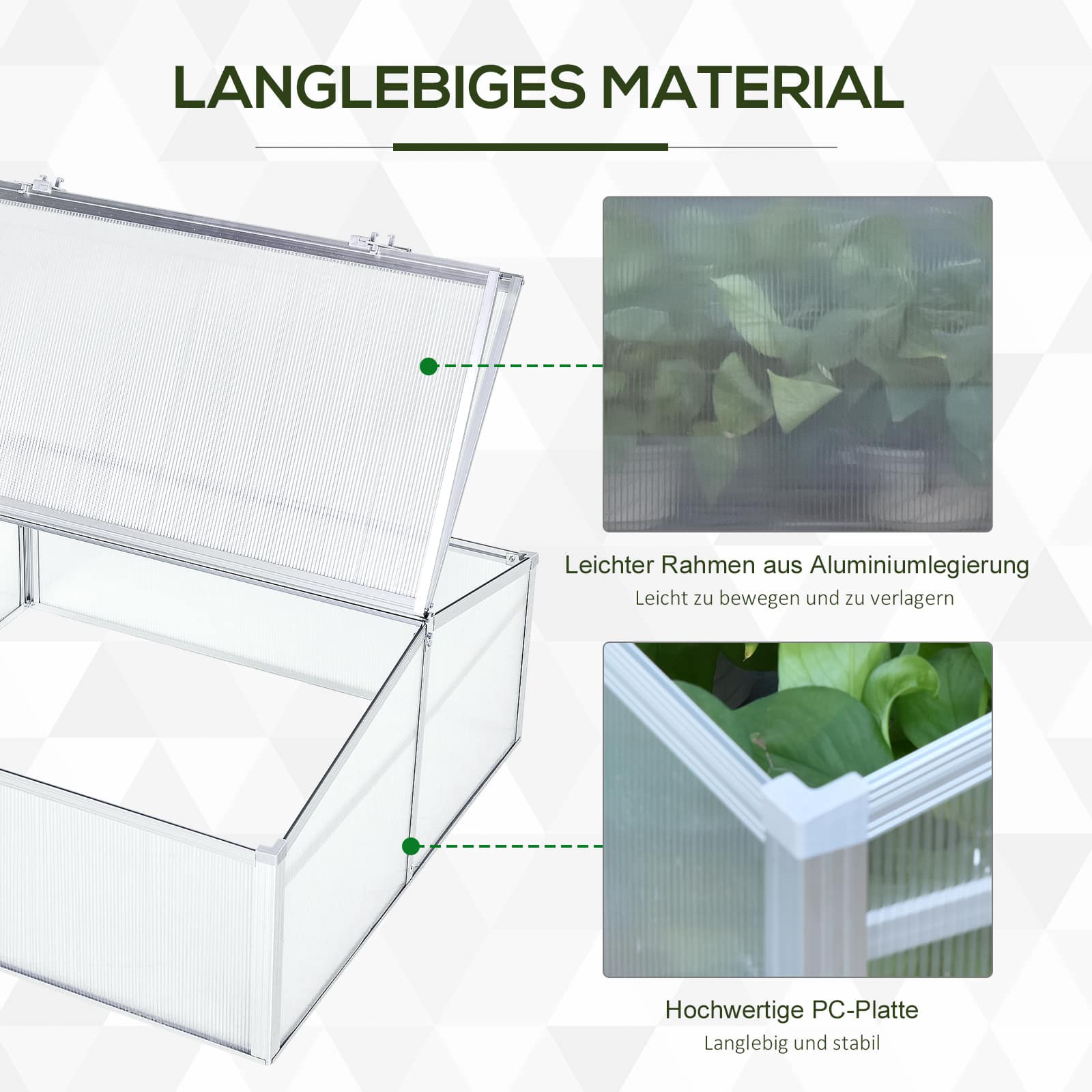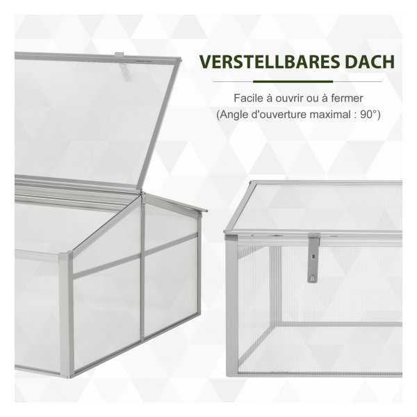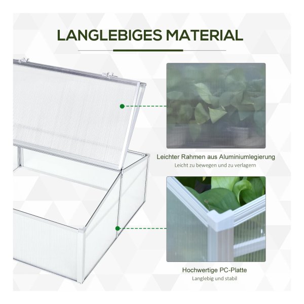 De kweekkas is uitgerust met lichtgroene zijwanden die gemaakt zijn van UV-bestendig polycarbonaat. Dit materiaal zorgt voor een optimale lichtinval en warmteopslag, waardoor je planten zich optimaal kunnen ontwikkelen. Bovendien zijn de twee deksels eenvoudig te openen en te sluiten, waardoor je gemakkelijk bij je planten kunt en zorgt voor een goede ventilatie in de kas. Met een vloeroppervlakte van 1 vierkante meter biedt de kweekkas voldoende ruimte voor al jouw tuinieravonturen.