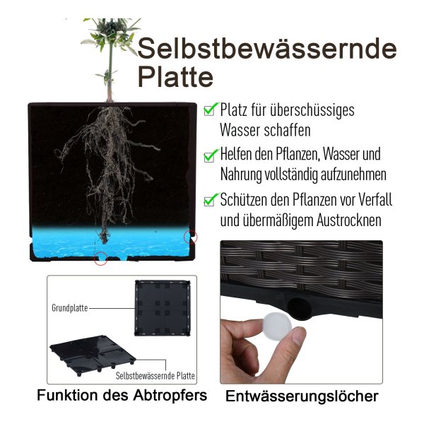 De Hoogwaardige Bloembak — Afvoergaten – Bruin is gemaakt van hoogwaardig plastic dat lang meegaat. Het RatanStyle-ontwerp geeft een luxe uitstraling aan uw buitenruimte. Dankzij de afvoergaten worden uw planten beschermd tegen te veel water en kunnen ze optimaal groeien.