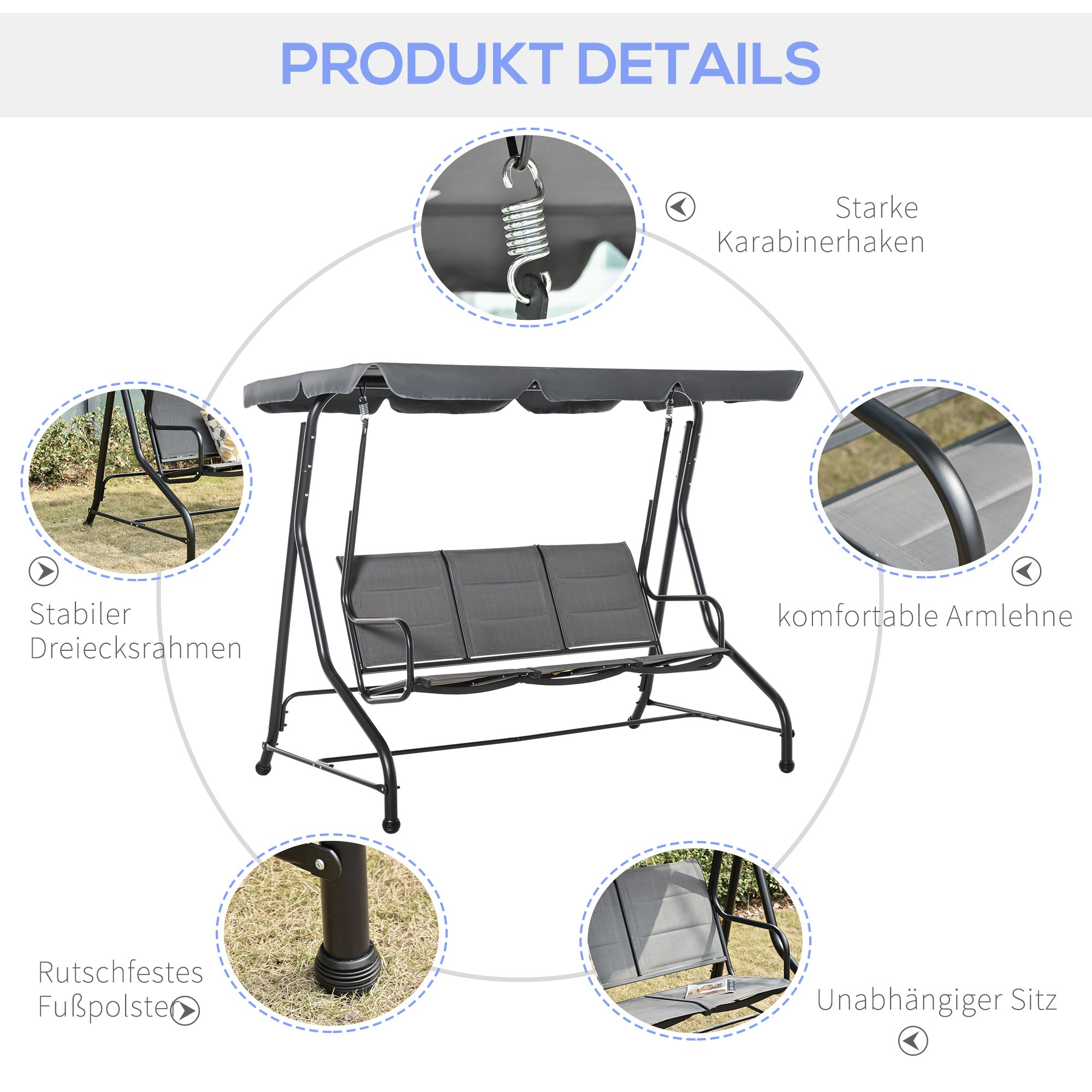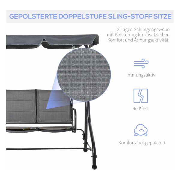 Deze tuinschommelbank is ontworpen met oog voor detail en comfort. Het dubbellagige lusweefsel zorgt voor een betere luchtcirculatie en verhoogt het zitcomfort. Daarnaast zijn de anti-slip voetpads een garantie voor extra stabiliteit, zodat je onbezorgd kunt genieten van het schommelen.
