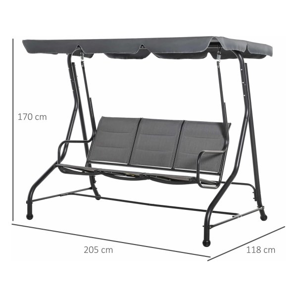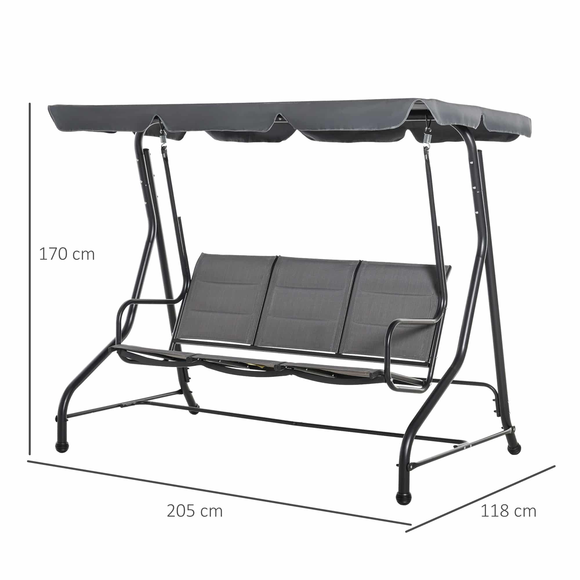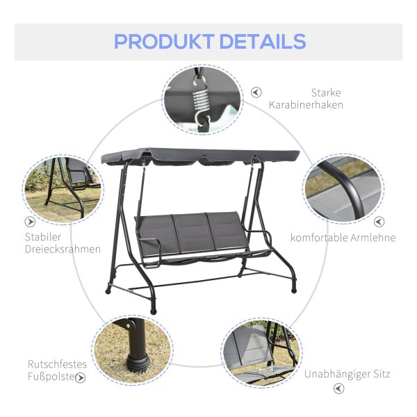 De Tuinschommelbank – Hollywood Swing – Verstelbaar zonnedak – Grijs is gemaakt van hoogwaardige materialen, waaronder staal, polyester en 3D verticaal schuim. De afmetingen van deze tuinschommelbank bedragen 205L x 118B x 170H cm, met een zithoogte van 52 cm. Dankzij de solide constructie is deze tuinschommelbank geschikt voor langdurig gebruik en biedt hij jarenlang plezier in je tuin.