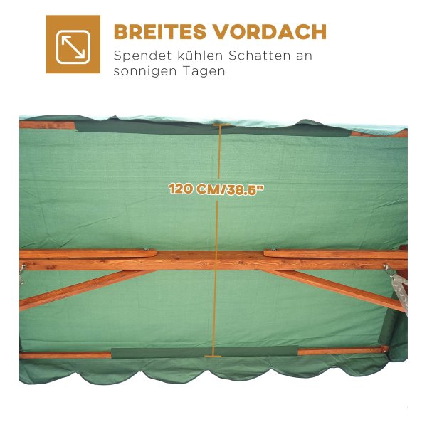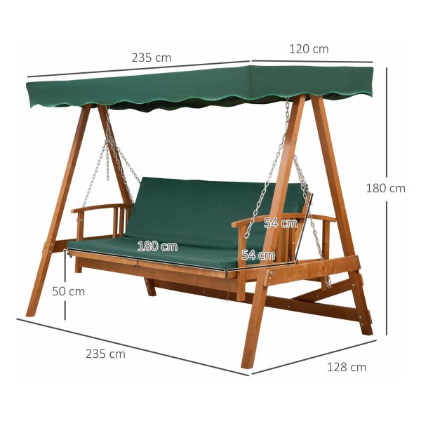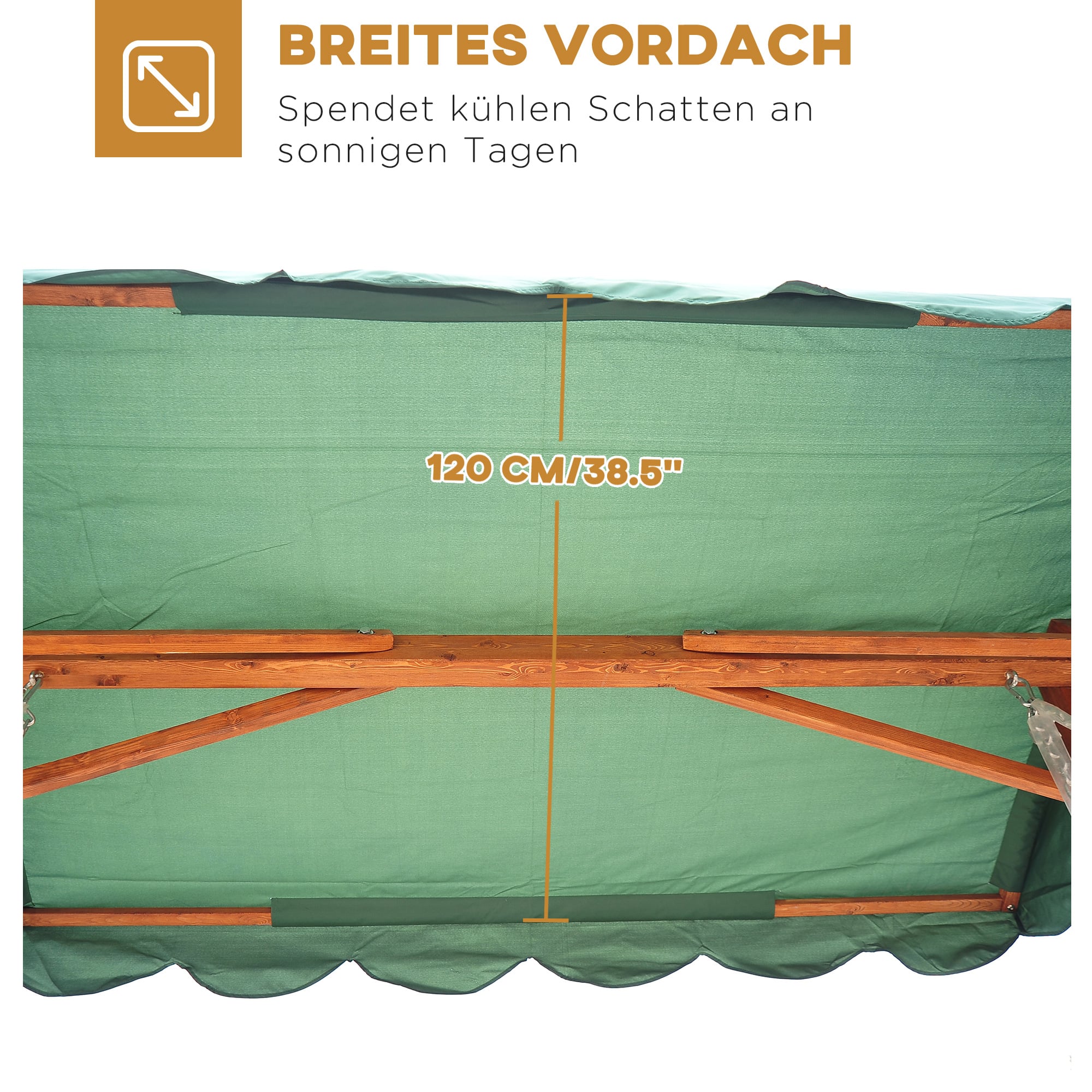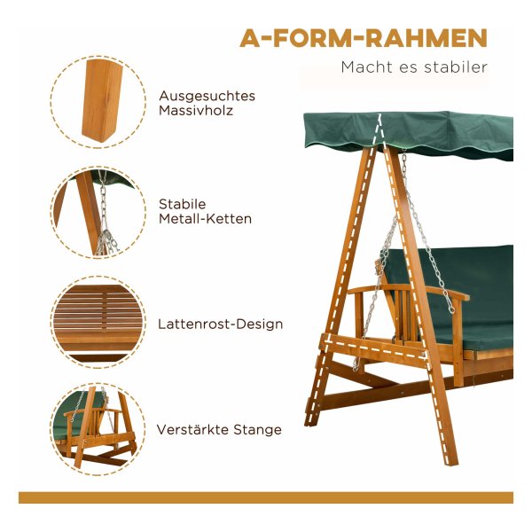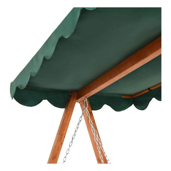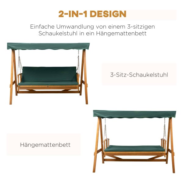 Duurzame houten tuinschommel met zonnedak en ligfunctie voor 3 personen in groen