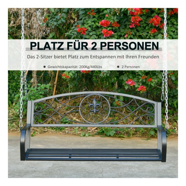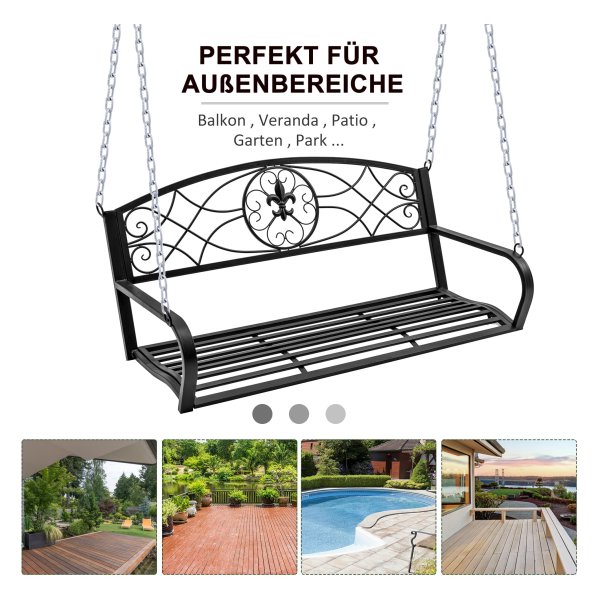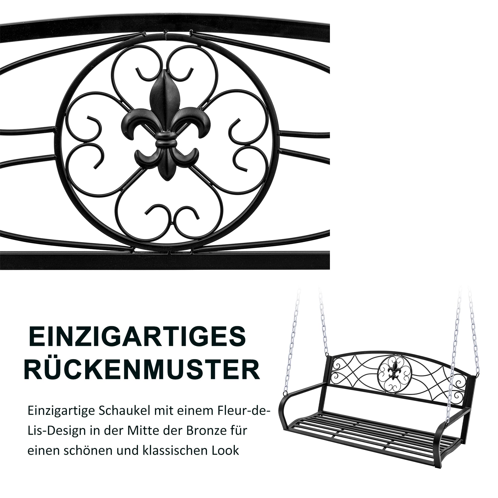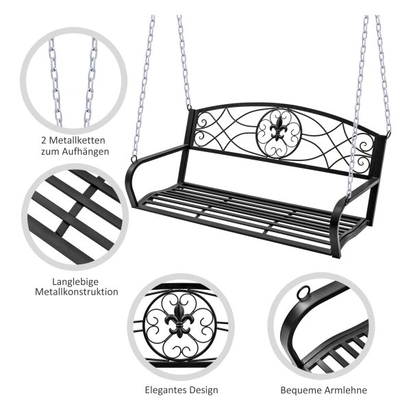De Hollywood Swing wordt geleverd met stevige metalen kettingen voor eenvoudige installatie. Let op: het frame is niet inbegrepen in de levering, maar kan eenvoudig worden gemonteerd in jouw tuin of op jouw terras. Maak van jouw buitenruimte een romantische en ontspannen plek met de Schommelbank – Hollywood Swing – Weerbestendig – Zwart.