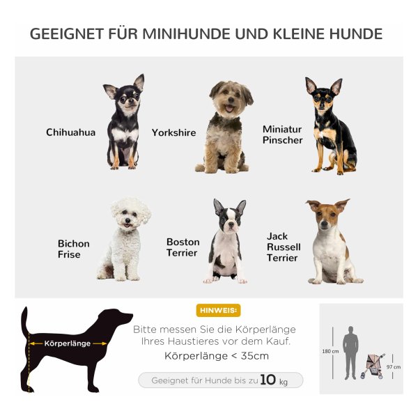 De Hondenbuggy is geschikt voor kleine honden en miniatuurhonden met een lichaamslengte van minder dan 35 cm en een gewicht van minder dan 10 kg. Dit maakt het ideaal voor het comfortabel vervoeren van je geliefde huisdier, zelfs als hij wat extra zorg nodig heeft.
