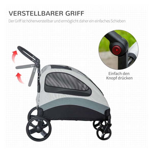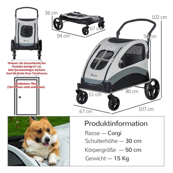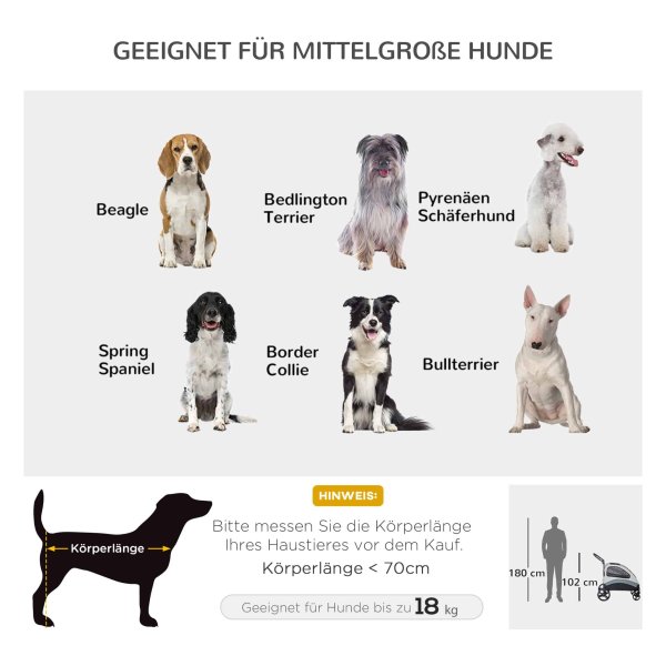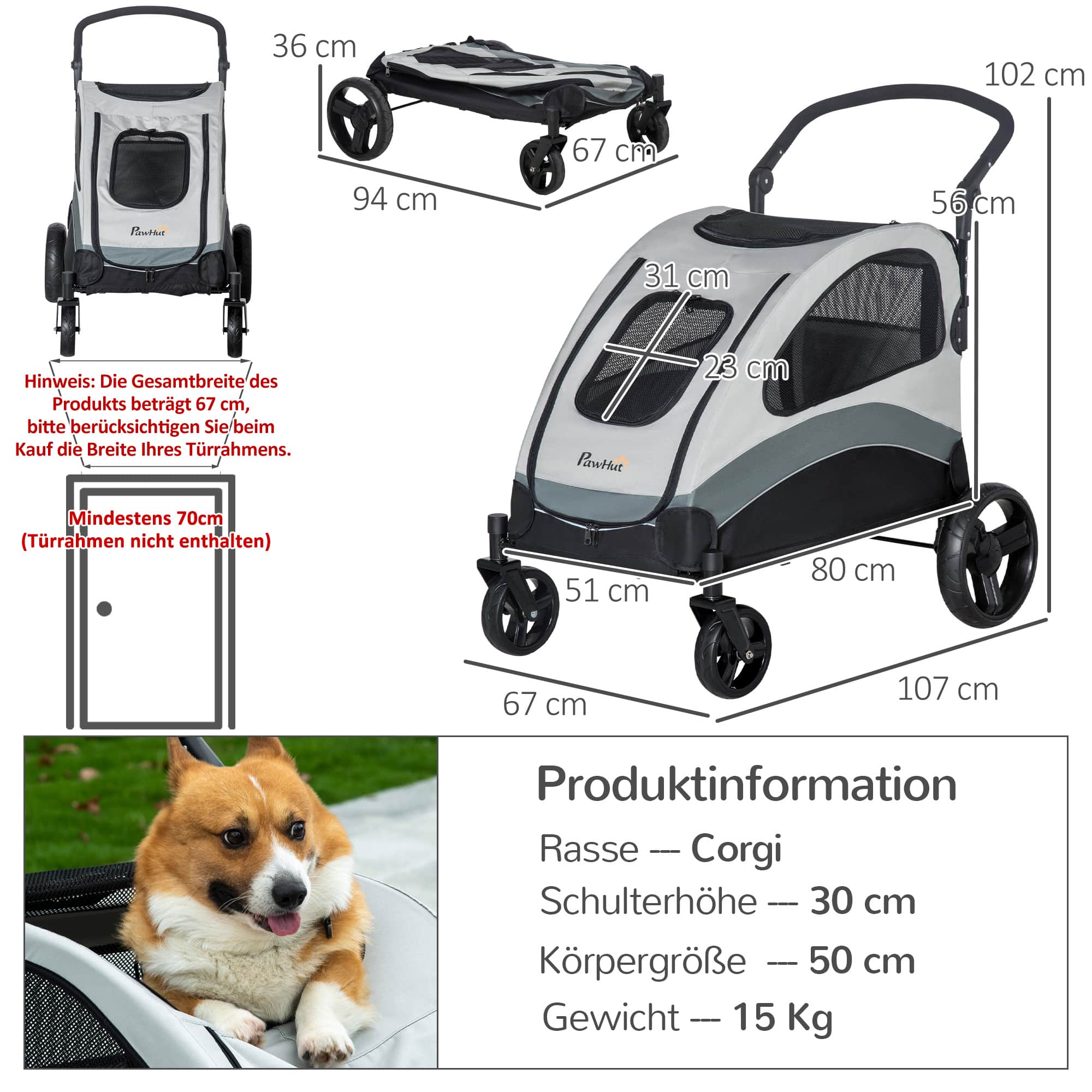 Let op: de hondenbuggy is geschikt voor honden van het formaat Golden Retriever, Labrador en andere honden van vergelijkbare grootte. Zorg ervoor dat uw huisdier comfortabel kan zitten en genoeg ruimte heeft om te bewegen.