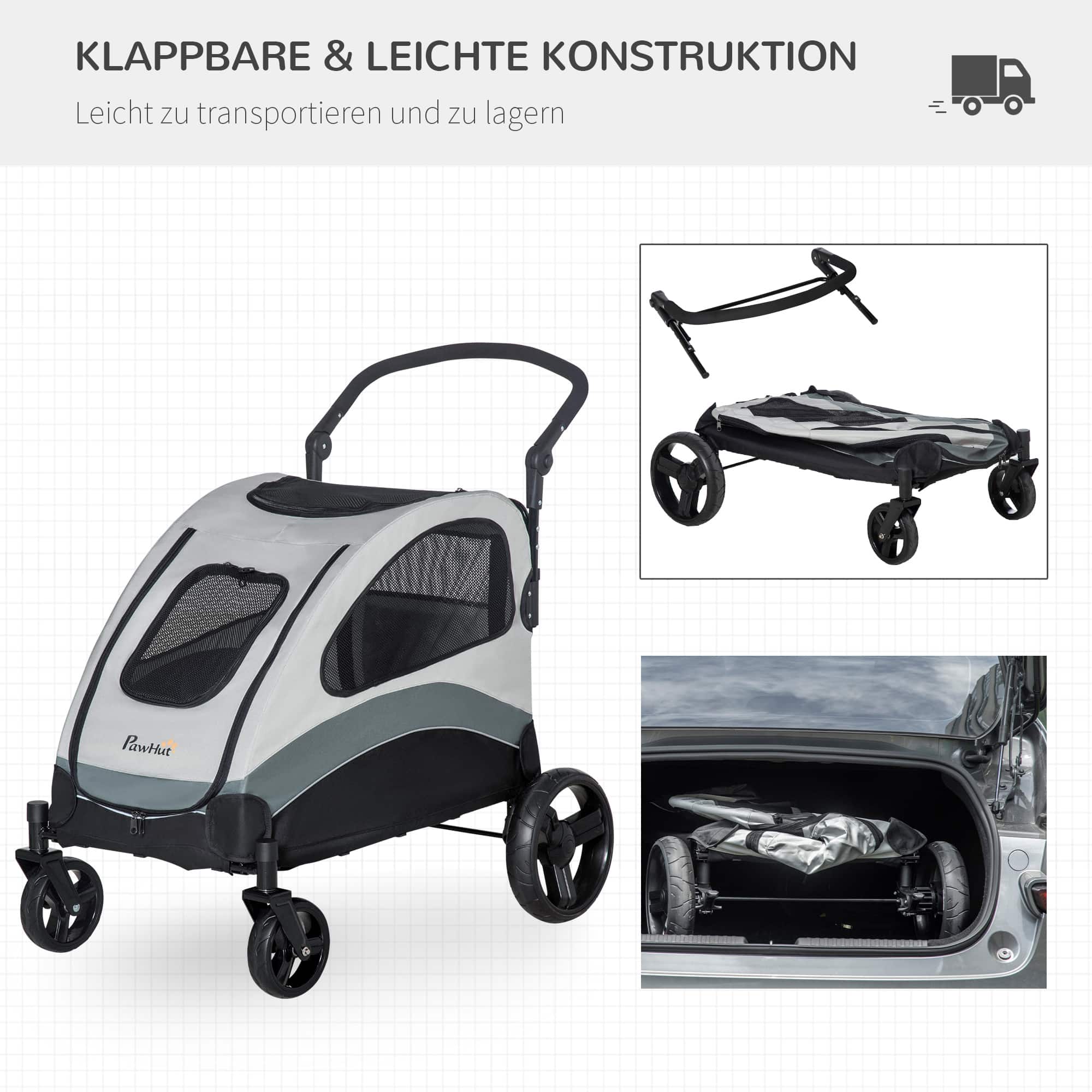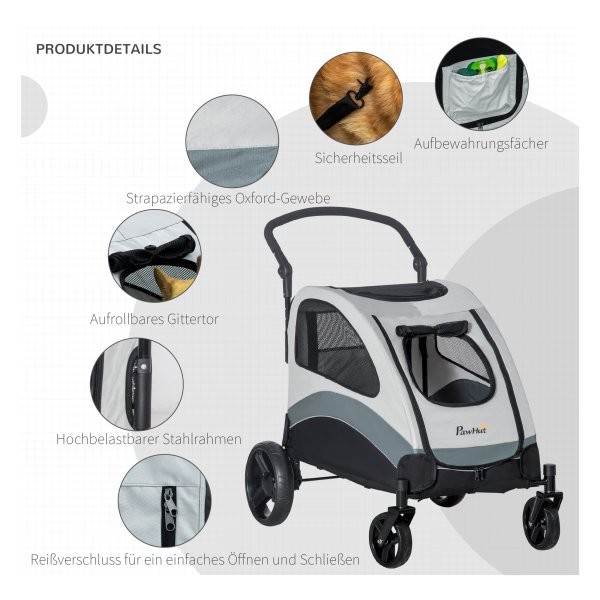 De buggy is geschikt voor middelgrote hondenrassen en beschikt over 4 grote wielen voor een soepele en stabiele rit. Het inklapbare frame en eenvoudige montage maken het gemakkelijk om de buggy op te bergen of mee te nemen. De stoffen bekleding met ritsen en het zitkussen zijn eenvoudig te verwijderen en schoon te maken voor een frisse uitstraling.