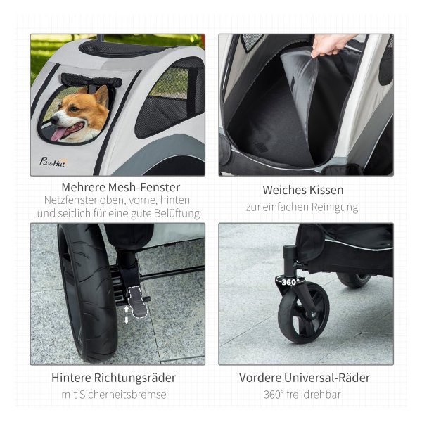 De hondenbuggy is voorzien van een veiligheidslijn die extra beveiliging biedt, zodat u met een gerust hart op pad kunt gaan. Dankzij de ingebouwde vensters geniet uw hond van voldoende ventilatie en een goed zicht op zijn omgeving. De voorwielen zijn 360 graden draaibaar, terwijl de achterwielen zijn uitgerust met remmen voor extra stabiliteit tijdens het rijden.