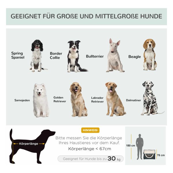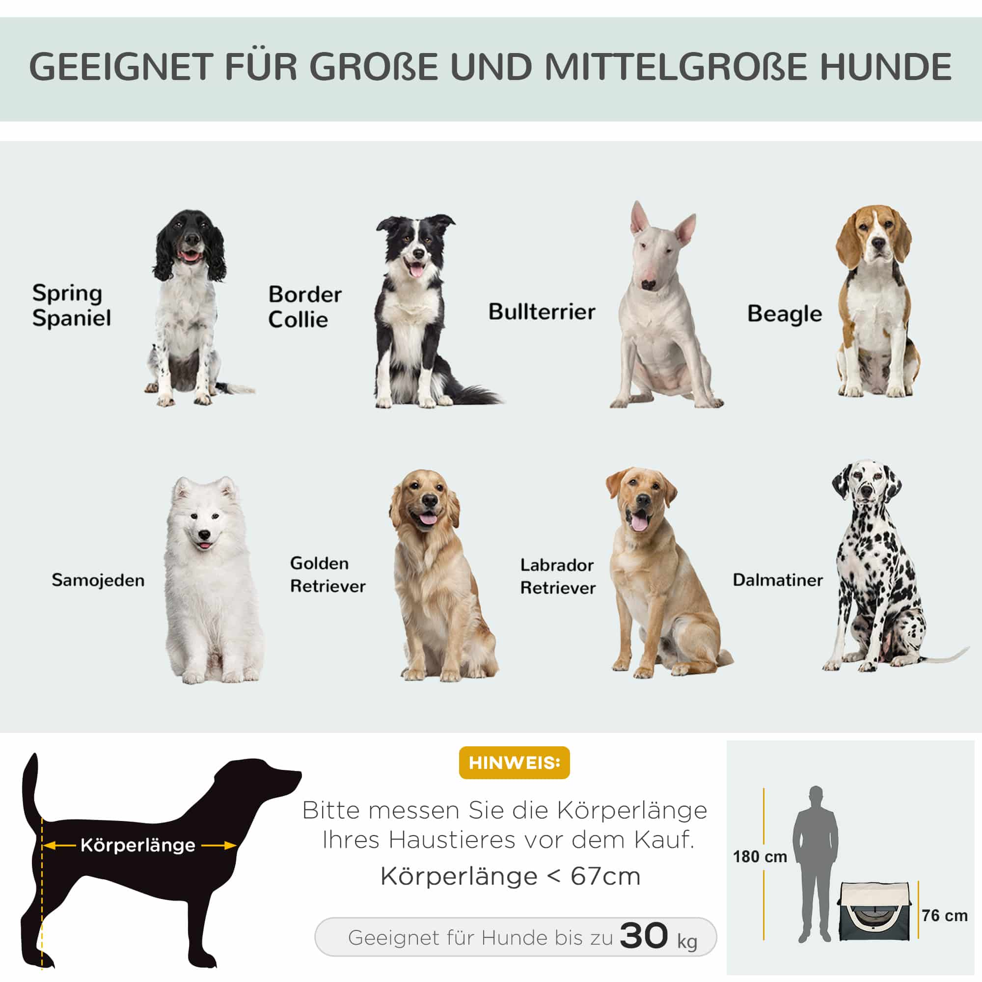 De hondentransportbox biedt niet alleen een veilige en comfortabele reis voor jouw huisdier, maar ook voor jou als eigenaar. Het is geschikt voor middelgrote en grote honden met een lichaamslengte van minder dan 67 cm en een gewicht van minder dan 30 kg. Met deze box hoef je je geen zorgen te maken over het transport van jouw viervoeter.