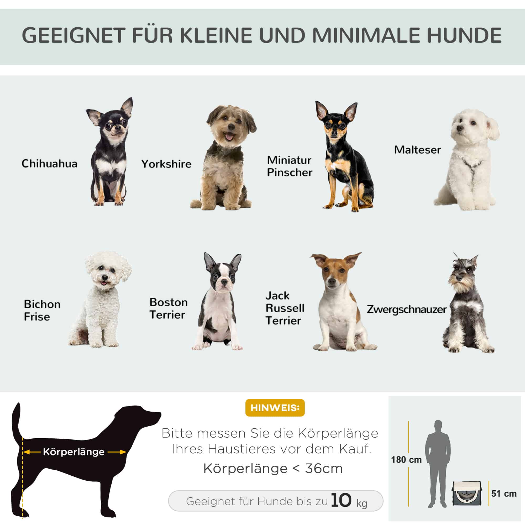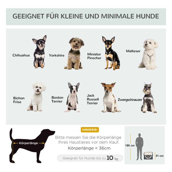 - Geschikt voor miniatuurhonden en kleine honden met een lichaamslengte van minder dan 36 cm en een gewicht van minder dan 10 kg
