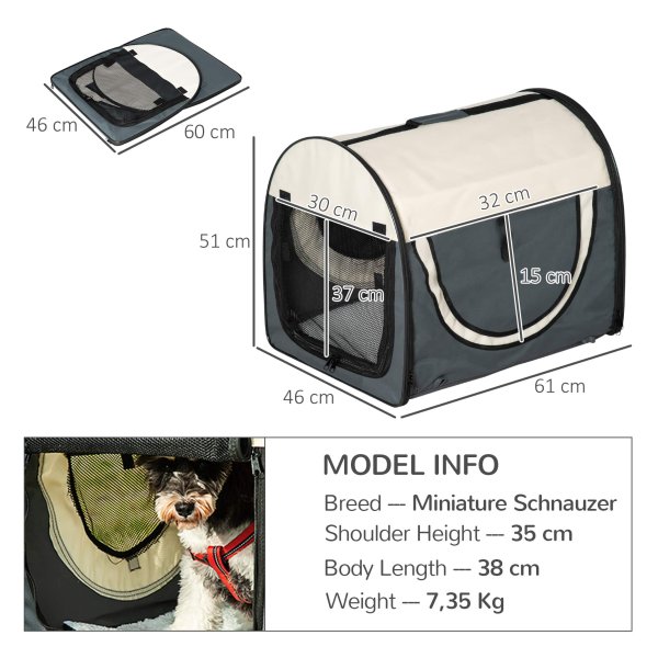 Met totale afmetingen van 61L x 46B x 51H cm en vouwafmetingen van 60L x 46B x 7H cm, biedt deze transportdoos voldoende ruimte voor uw hond om comfortabel te zitten of liggen tijdens het vervoer. De maximale draagkracht is 10 kg, waardoor de transportdoos geschikt is voor verschillende kleine hondenrassen.