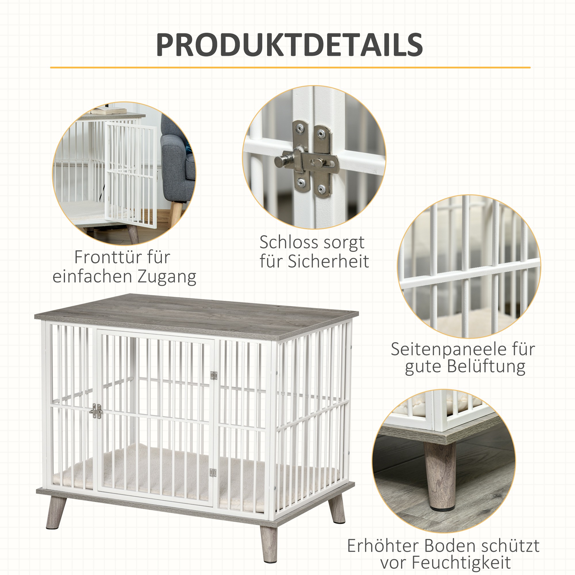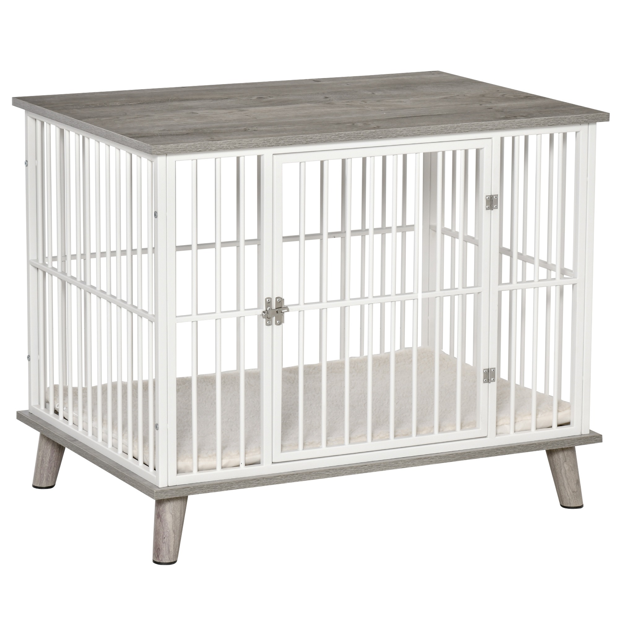 - Het witte en grijze kleurenschema van de hondenbench geeft een luxe uitstraling aan uw interieur.