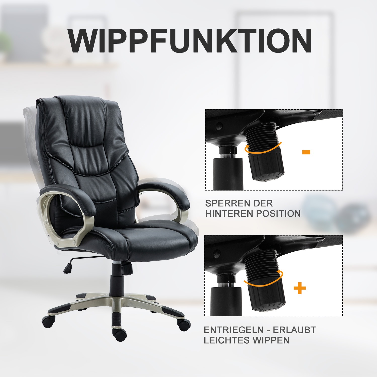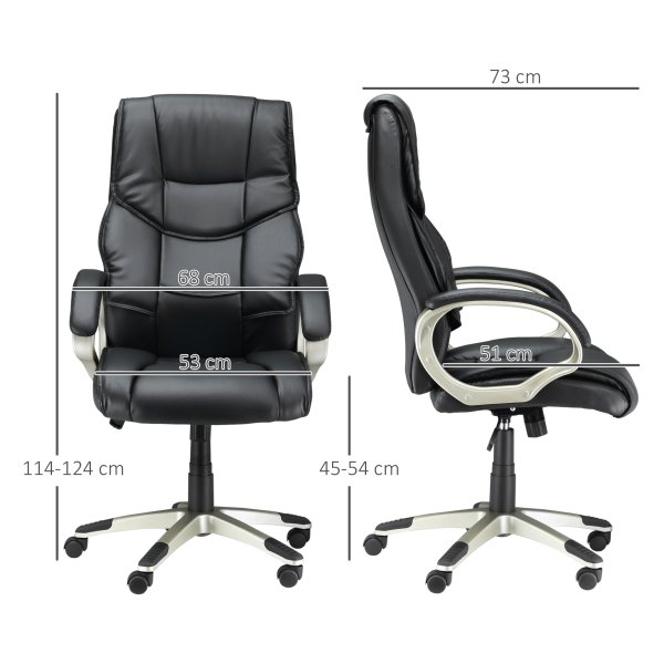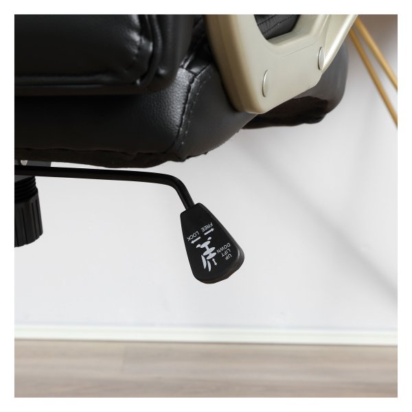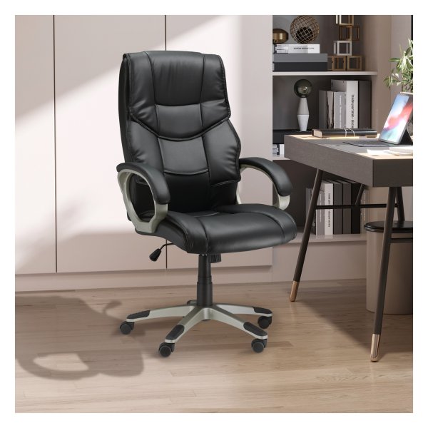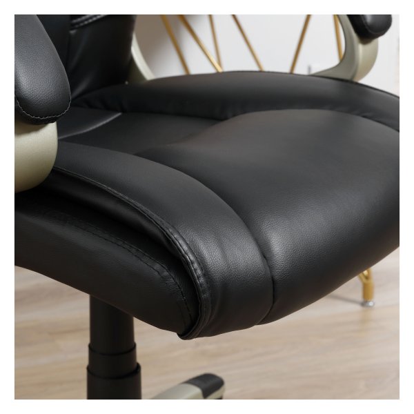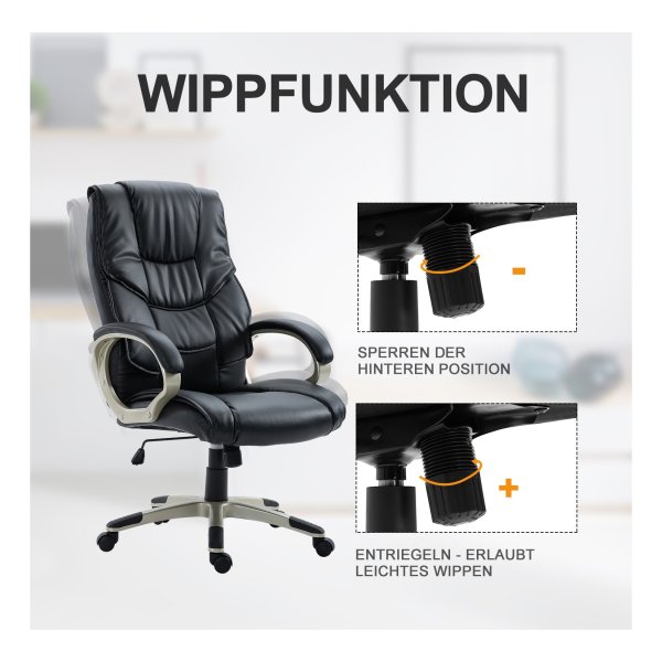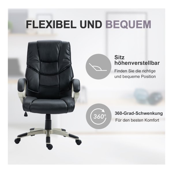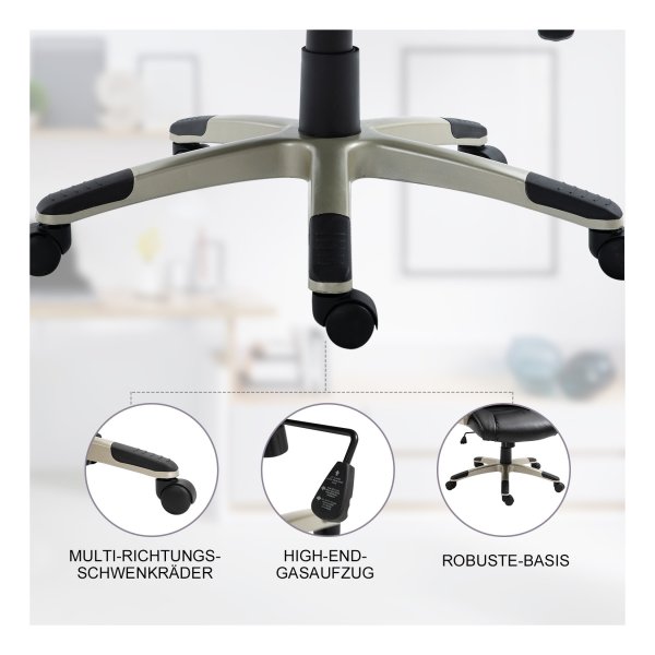 De bureaustoel is voorzien van een hoogwaardig oppervlak gemaakt van synthetisch leer, dat slijtagebestendig is en gemakkelijk te onderhouden. De vijf rollen van de stoel zijn 360 graden roteerbaar en bewegen extreem stil, waardoor je moeiteloos kunt bewegen en multitasken tijdens het werk.